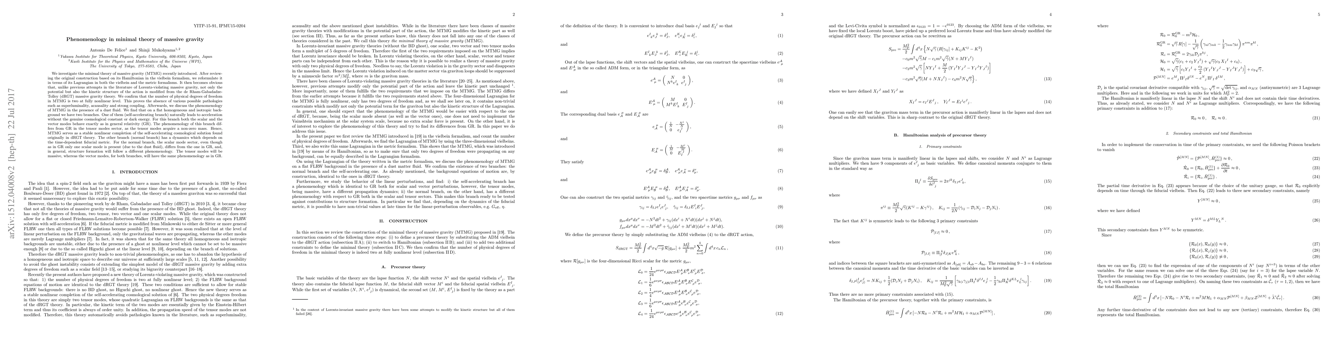 This paper reformulates the minimal theory of massive gravity (MTMG) in Lagrangian terms and confirms it has two physical degrees of freedom, avoiding pathologies. It explores MTMG's phenomenology in a dust fluid context, identifying two branches: a self-accelerating branch that mimics general relativity except for massive tensor modes, and a normal branch with distinct scalar mode dynamics and massive tensor modes.