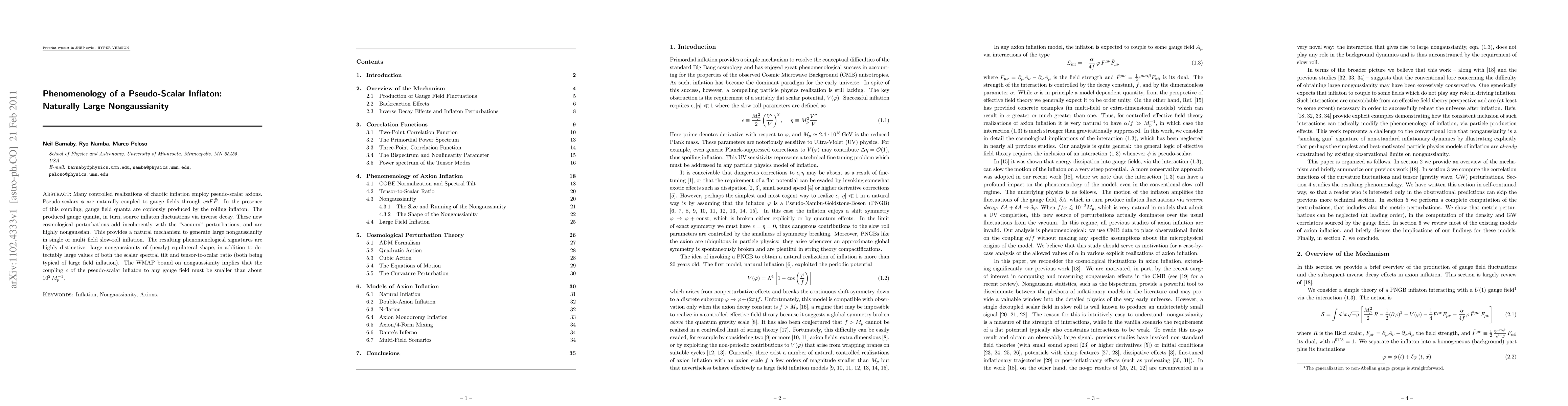 This paper explores the phenomenology of a pseudo-scalar inflaton, showing how its coupling to gauge fields can naturally generate large nongaussianity in inflation. The study finds distinctive signatures, including large nongaussianity of an equilateral shape and significant scalar spectral tilt and tensor-to-scalar ratio, constrained by WMAP data.