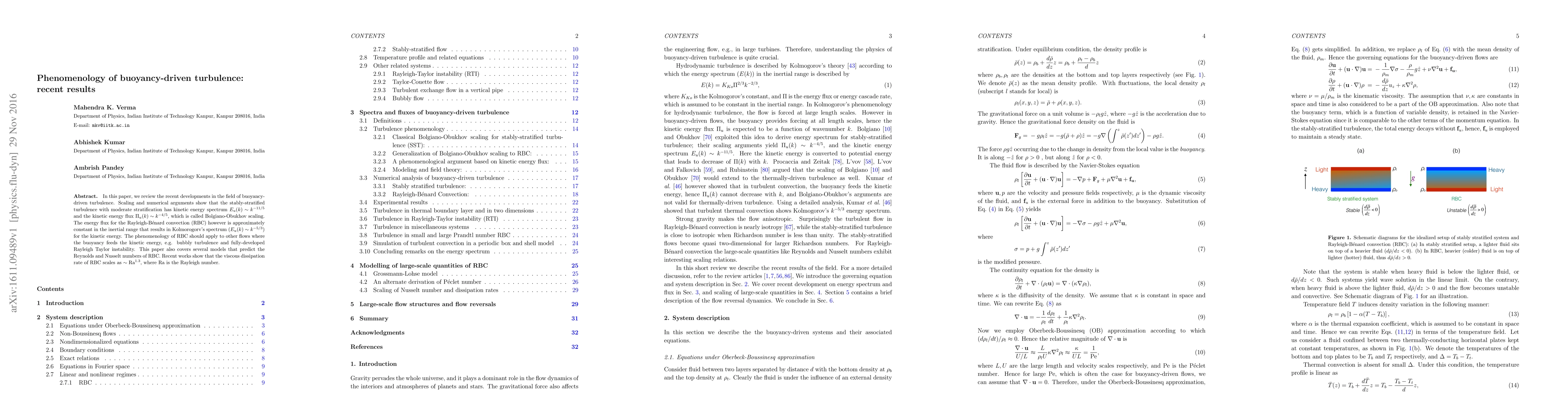 In this paper, we review the recent developments in the field of buoyancy-driven turbulence. Scaling and numerical arguments show that the stably-stratified turbulence with moderate stratification has kinetic energy spectrum $E_u(k) \sim k^{-11/5}$ and the kinetic energy flux $\Pi_u(k) \sim k^{-4/5}$, which is called Bolgiano-Obukhov scaling. The energy flux for the Rayleigh-B\'{e}nard convection (RBC) however is approximately constant in the inertial range that results in Kolmorogorv's spectrum ($E_u(k) \sim k^{-5/3}$) for the kinetic energy. The phenomenology of RBC should apply to other flows where the buoyancy feeds the kinetic energy, e.g. bubbly turbulence and fully-developed Rayleigh Taylor instability. This paper also covers several models that predict the Reynolds and Nusselt numbers of RBC. Recent works show that the viscous dissipation rate of RBC scales as $\sim \mathrm{Ra}^{1.3}$, where $\mathrm{Ra}$ is the Rayleigh number.