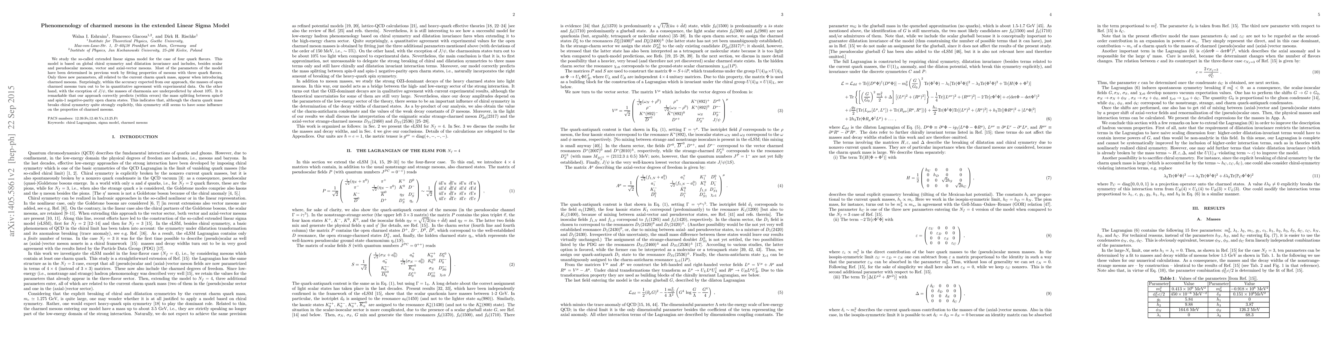 We study the so-called extended linear sigma model for the case of four quark flavors. This model is based on global chiral symmetry and dilatation invariance and includes, besides scalar and pseudoscalar mesons, vector and axial-vector mesons. Most of the parameters of the model have been determined in previous work by fitting properties of mesons with three quark flavors. Only three new parameters, all related to the current charm quark mass, appear when introducing charmed mesons. Surprisingly, within the accuracy expected from our approach, the masses of open charmed mesons turn out to be in quantitative agreement with experimental data. On the other hand, with the exception of $J/\psi$, the masses of charmonia are underpredicted by about 10\%. It is remarkable that our approach correctly predicts (within errors) the mass splitting between spin-0 and spin-1 negative-parity open charm states. This indicates that, although the charm quark mass breaks chiral symmetry quite strongly explicitly, this symmetry still seems to have some influence on the properties of charmed mesons.