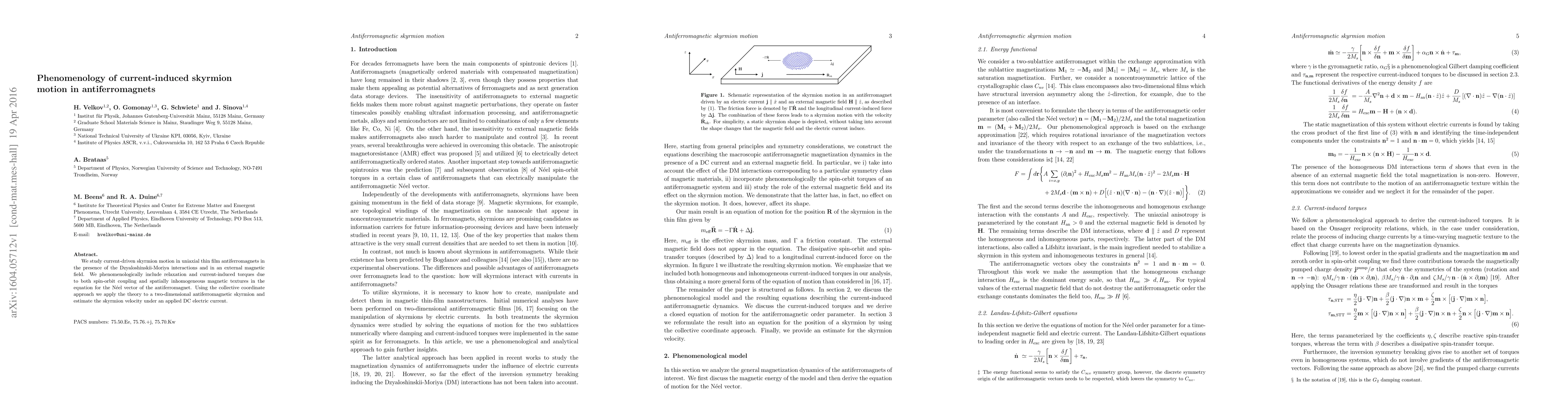 This paper investigates the motion of skyrmions in thin film antiferromagnets driven by current, considering Dzyaloshinskii-Moriya interactions and external magnetic fields. It employs a phenomenological approach to include relaxation and current-induced torques, estimating skyrmion velocity under DC electric current using the collective coordinate method.