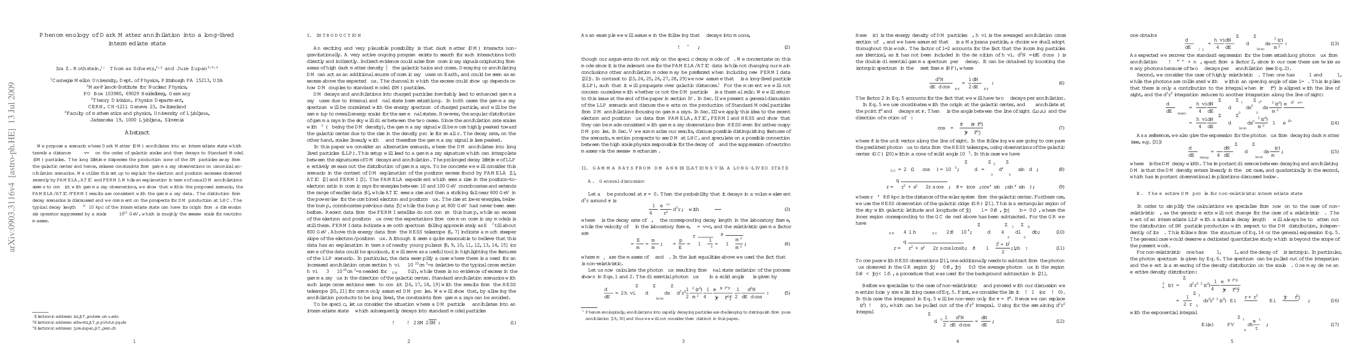 The paper proposes that dark matter particles annihilate into long-lived intermediate states that decay far from the galactic center, explaining observed cosmic ray excesses while avoiding gamma-ray constraints. This scenario links the decay length to high-energy physics scales and suggests potential signals at the LHC.