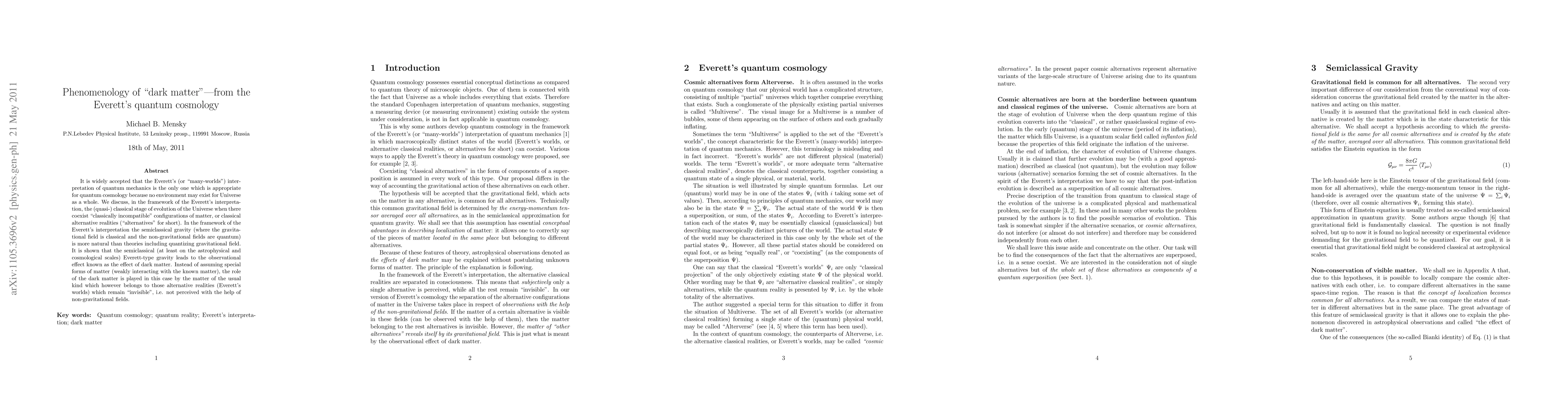 It is widely accepted that the Everett's (or "many-worlds") interpretation of quantum mechanics is the only one which is appropriate for quantum cosmology because no environment may exist for Universe as a whole. We discuss, in the framework of the Everett's interpretation, the (quasi-) classical stage of evolution of the Universe when there coexist "classically incompatible" configurations of matter, or classical alternative realities ("alternatives" for short). In the framework of the Everett's interpretation the semiclassical gravity (where the gravitational field is classical and the non-gravitational fields are quantum) is more natural than theories including quantizing gravitational field. It is shown that the semiclassical (at least on the astrophysical and cosmological scales) Everett-type gravity leads to the observational effect known as the effect of dark matter. Instead of assuming special forms of matter (weakly interacting with the known matter), the role of the dark matter is played in this case by the matter of the usual kind which however belongs to those alternative realities (Everett's worlds) which remain {\guillemotleft}invisible{\guillemotright}, i.e. not perceived with the help of non-gravitational fields.