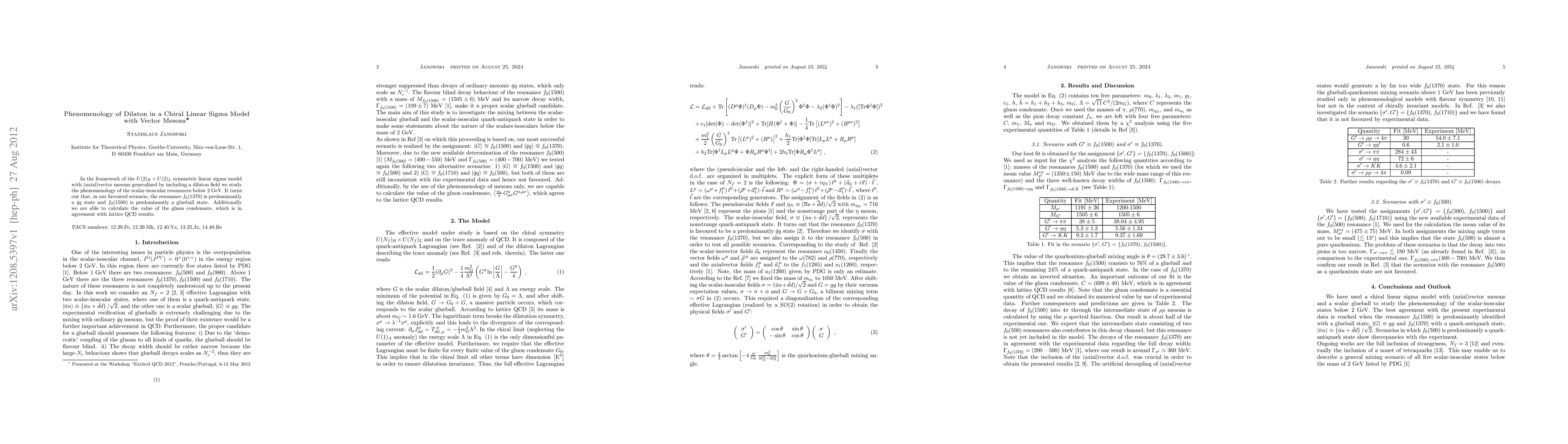 This paper explores the phenomenology of scalar-isoscalar resonances below 2 GeV within a chiral linear sigma model augmented by a dilaton field and vector mesons. The study finds that $f_{0}(1370)$ is mainly a quark-antiquark state, while $f_{0}(1500)$ is primarily a glueball, and the calculated gluon condensate aligns with lattice QCD findings.