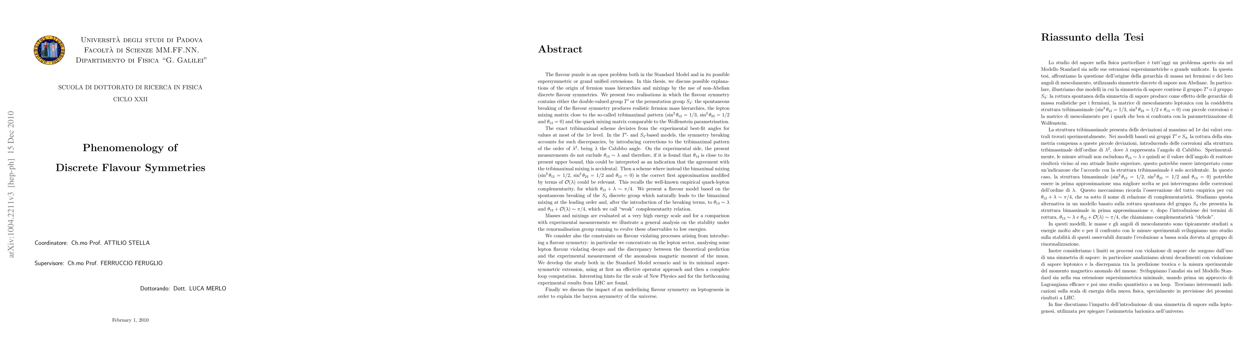 The flavour puzzle is an open problem both in the Standard Model and in its possible supersymmetric or grand unified extensions. In this thesis, we discuss possible explanations of the origin of fermion mass hierarchies and mixings by the use of non-Abelian discrete flavour symmetries. We present a T'- and an S4-based realisations in which the spontaneous breaking of the symmetry produces realistic fermion mass hierarchies, the quark mixing matrix comparable to the Wolfenstein parametrisation and the lepton mixing matrix close to the so-called tribimaximal pattern. We also present an alternative S4-based flavour model which naturally leads to the weak complementarity relation with a relatively large lepton reactor angle. Masses and mixings are evaluated at a very high energy scale and for a comparison with experimental measurements we illustrate a general analysis on the stability under the renormalisation group running to evolve these observables to low energies. We consider also the constraints on flavour violating processes arising from introducing a flavour symmetry: in particular we concentrate on the lepton sector, analysing some lepton flavour violating decays and the discrepancy between the theoretical prediction and the experimental measurement of the anomalous magnetic moment of the muon. Interesting hints for the scale of New Physics and for the forthcoming experimental results from LHC are found. Finally we discuss the impact of an underlining flavour symmetry on leptogenesis in order to explain the baryon asymmetry of the universe.