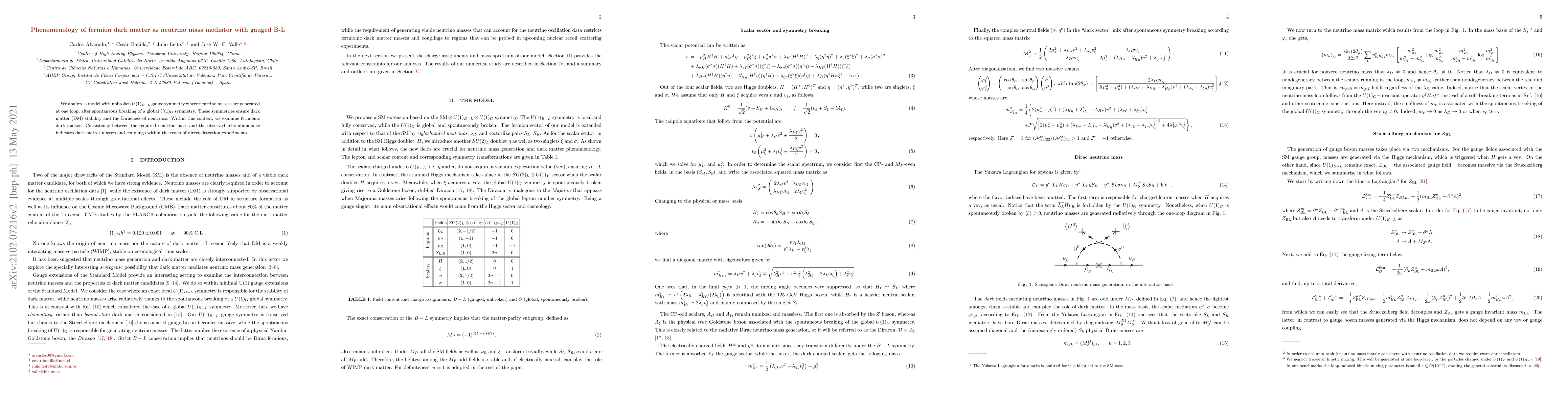This paper explores a model with gauged B-L symmetry where neutrino masses arise via one-loop processes, ensuring dark matter stability and Dirac neutrinos. It finds that fermionic dark matter in this framework could be detectable in direct experiments.
