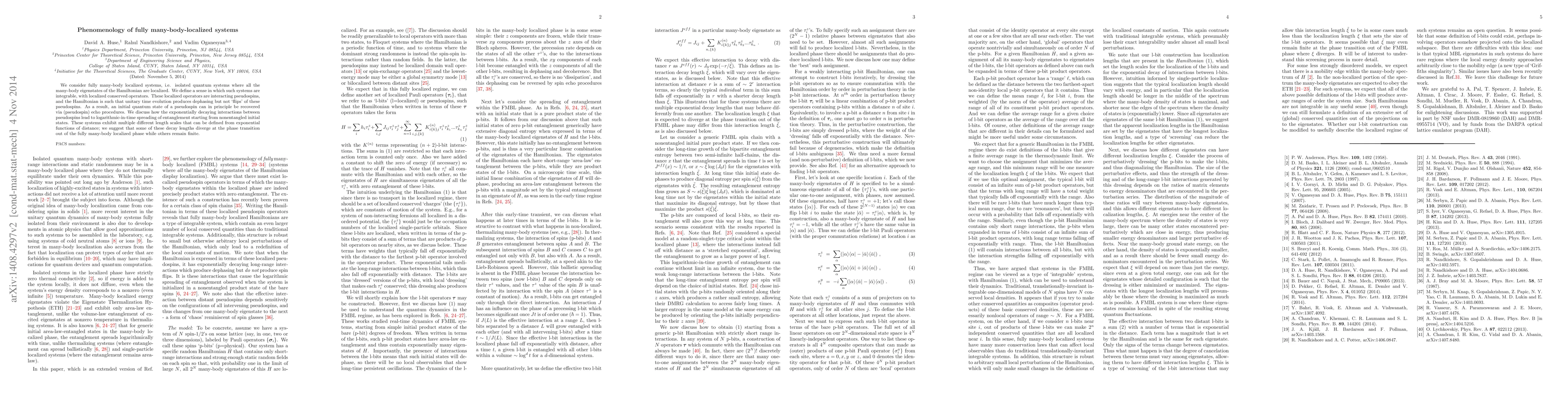 This paper explores fully many-body localized quantum systems, defining their integrability through localized conserved operators called pseudospins. It discusses the recovery of initial states via echo procedures and the logarithmic spreading of entanglement due to the systems' exponentially decaying interactions.