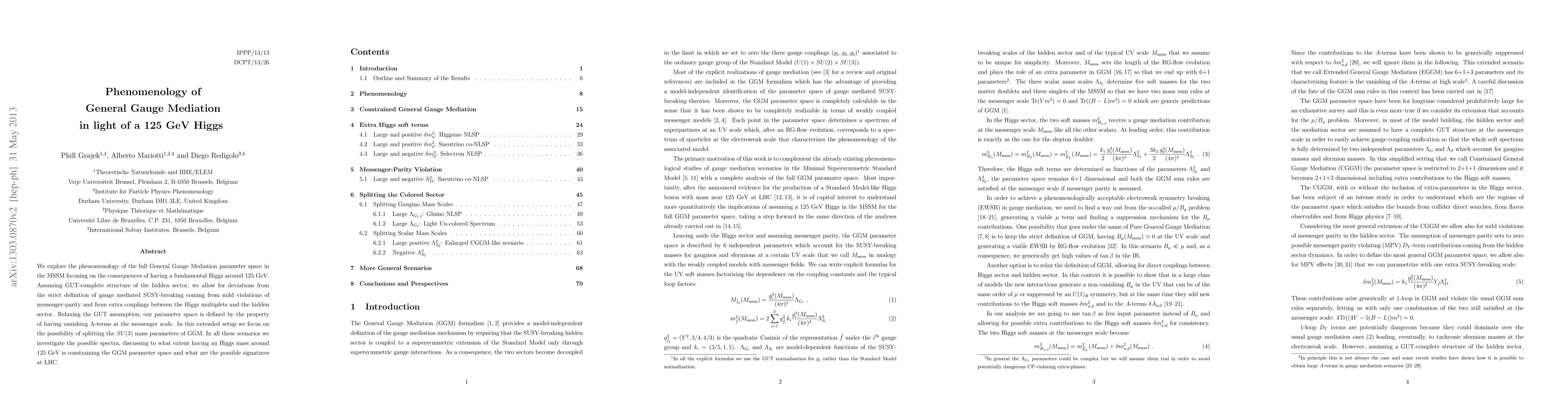 We explore the phenomenology of the full General Gauge Mediation parameter space in the MSSM focusing on the consequences of having a fundamental Higgs around 125 GeV. Assuming GUT-complete structure of the hidden sector, we allow for deviations from the strict definition of gauge mediated SUSY-breaking coming from mild violations of messenger-parity and from extra couplings between the Higgs multiplets and the hidden sector. Relaxing the GUT assumption, our parameter space is defined by the property of having vanishing A-terms at the messenger scale. In this extended setup we focus on the possibility of splitting the SU(3) mass parameters of GGM. In all these scenarios we investigate the possible spectra, discussing to what extent having an Higgs mass around 125 GeV is constraining the GGM parameter space and what are the possible signatures at LHC.