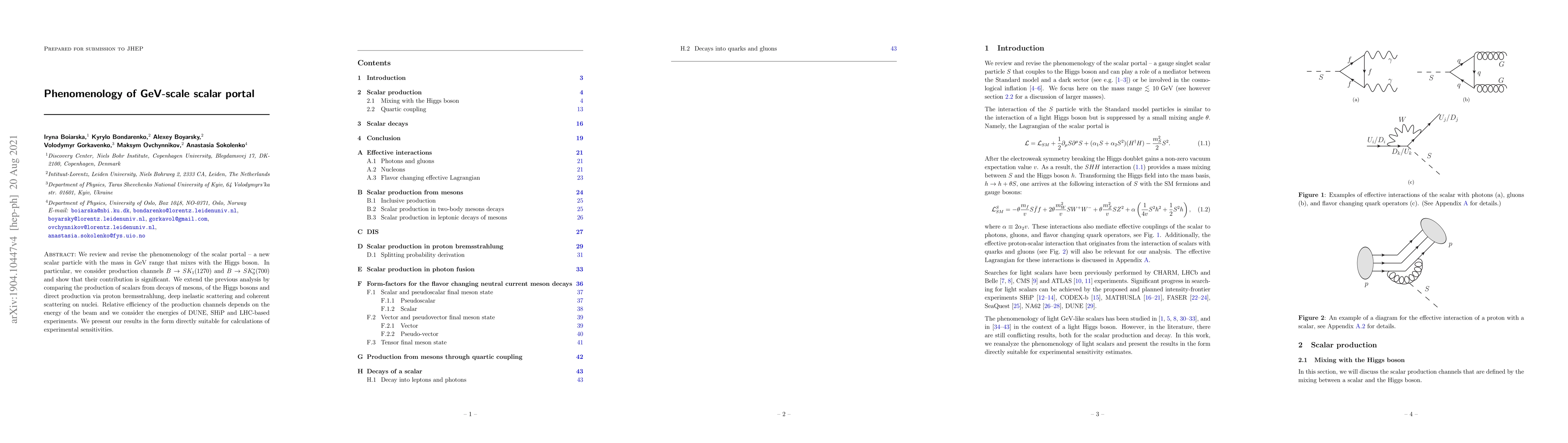 We review and revise the phenomenology of the scalar portal -- a new scalar particle with the mass in GeV range that mixes with the Higgs boson. In particular, we consider production channels $B\to S K_1(1270)$ and $B\to S K_0^*(700)$ and show that their contribution is significant. We extend the previous analysis by comparing the production of scalars from decays of mesons, of the Higgs bosons and direct production via proton bremsstrahlung, deep inelastic scattering and coherent scattering on nuclei. Relative efficiency of the production channels depends on the energy of the beam and we consider the energies of DUNE, SHiP and LHC-based experiments. We present our results in the form directly suitable for calculations of experimental sensitivities.