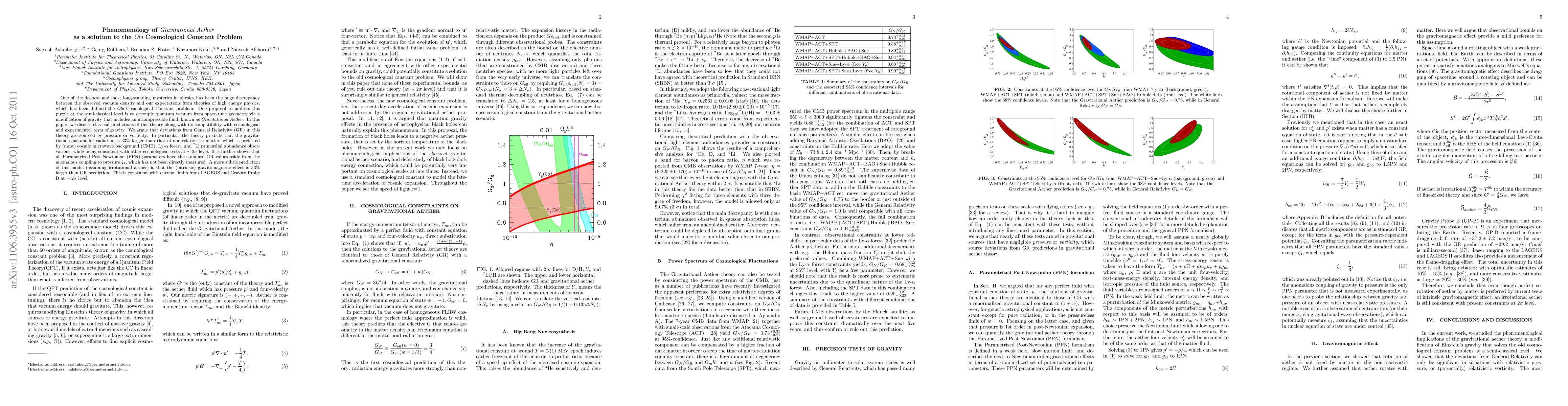 This paper explores the Gravitational Aether theory as a solution to the Old Cosmological Constant problem, proposing a modification of gravity involving an incompressible fluid to decouple quantum vacuum from space-time geometry. The theory predicts deviations from General Relativity, particularly a 33% larger gravitational constant for radiation compared to non-relativistic matter, consistent with various cosmological observations and experimental tests.