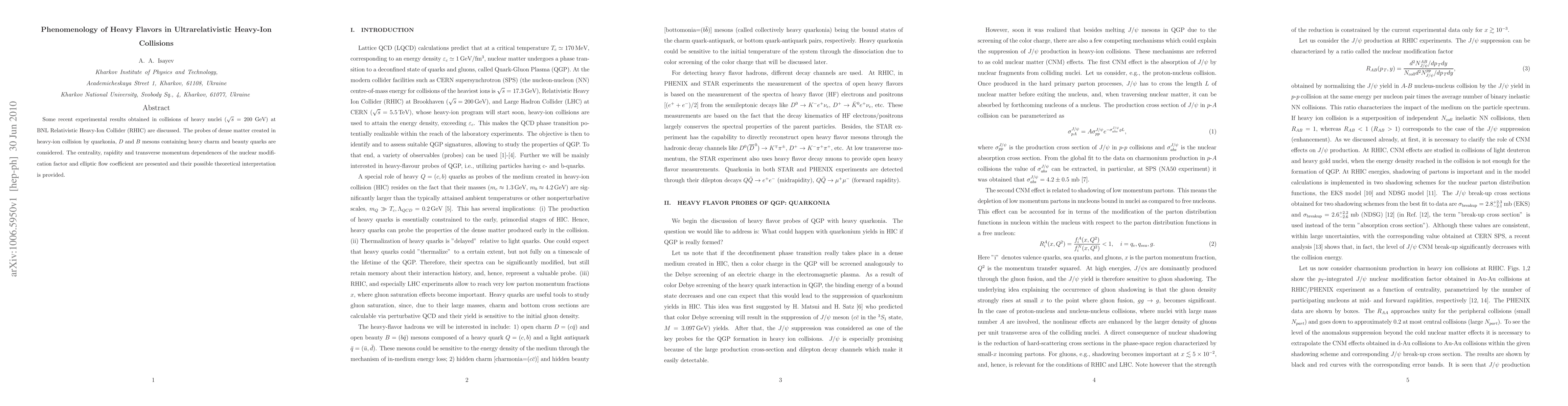Some recent experimental results obtained in collisions of heavy nuclei ($\sqrt{s}=200$ GeV) at BNL Relativistic Heavy-Ion Collider (RHIC) are discussed. The probes of dense matter created in heavy-ion collision by quarkonia, $D$ and $B$ mesons containing heavy charm and beauty quarks are considered. The centrality, rapidity and transverse momentum dependences of the nuclear modification factor and elliptic flow coefficient are presented and their possible theoretical interpretation is provided.
