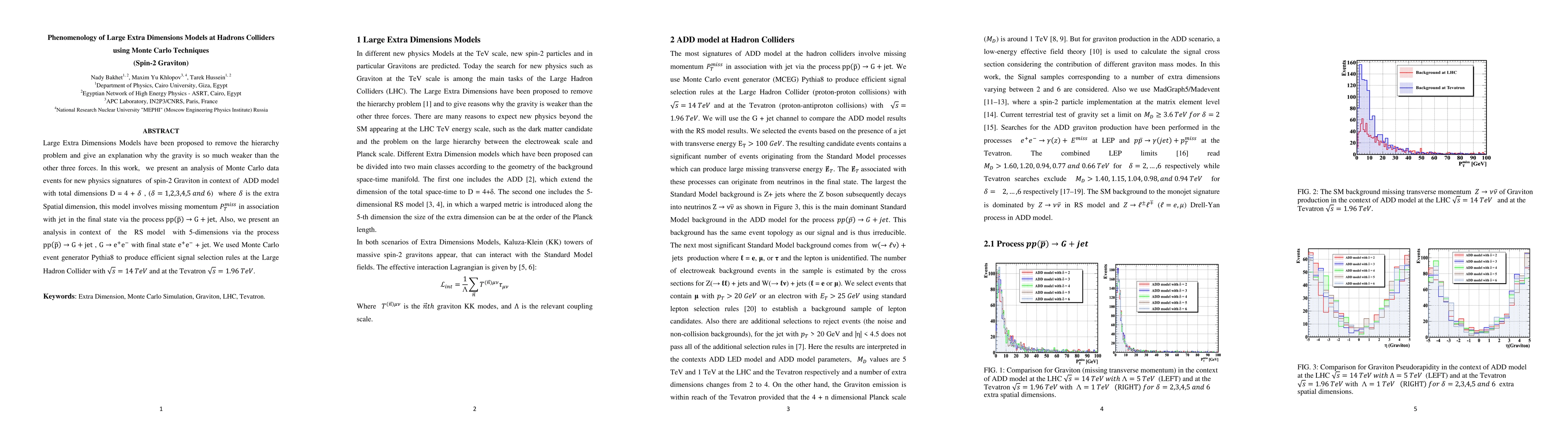 Large Extra Dimensions Models have been proposed to remove the hierarchy problem and give an explanation why the gravity is so much weaker than the other three forces. In this work, we present an analysis of Monte Carlo data events for new physics signatures of spin-2 Graviton in context of ADD model with total dimensions $D=4+\delta,$ $\delta = 1,2,3,4,5,6 $ where $ \delta $ is the extra special dimension, this model involves missing momentum $P_{T}^{miss}$ in association with jet in the final state via the process $pp(\bar{p}) \rightarrow G+jet$, Also, we present an analysis in context of the RS model with 5-dimensions via the process $pp(\bar{p}) \rightarrow G+jet$, $G \rightarrow e^{+}e^{-}$ with final state $e^{+}e^{-}+jet$. We used Monte Carlo event generator Pythia8 to produce efficient signal selection rules at the Large Hadron Collider with $\sqrt{s}$=14TeV and at the Tevatron $\sqrt{s}$=1.96TeV .