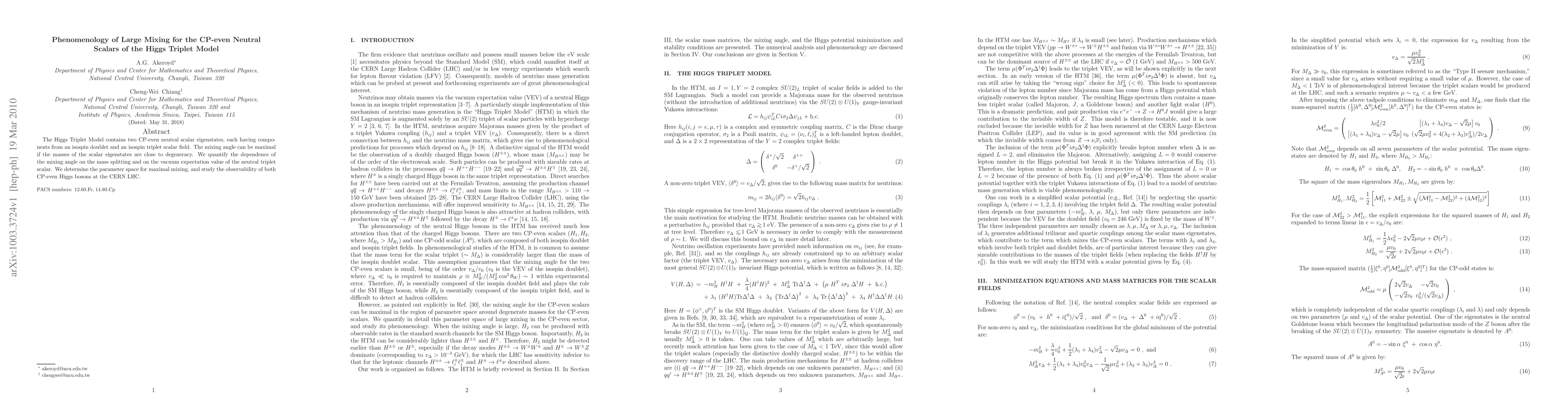This paper investigates the phenomenology of maximal mixing in the CP-even neutral scalars of the Higgs Triplet Model, quantifying the dependence on mass splitting and scalar field vacuum expectation values. The study determines the parameter space for maximal mixing and assesses the observability of these scalars at the CERN LHC.
