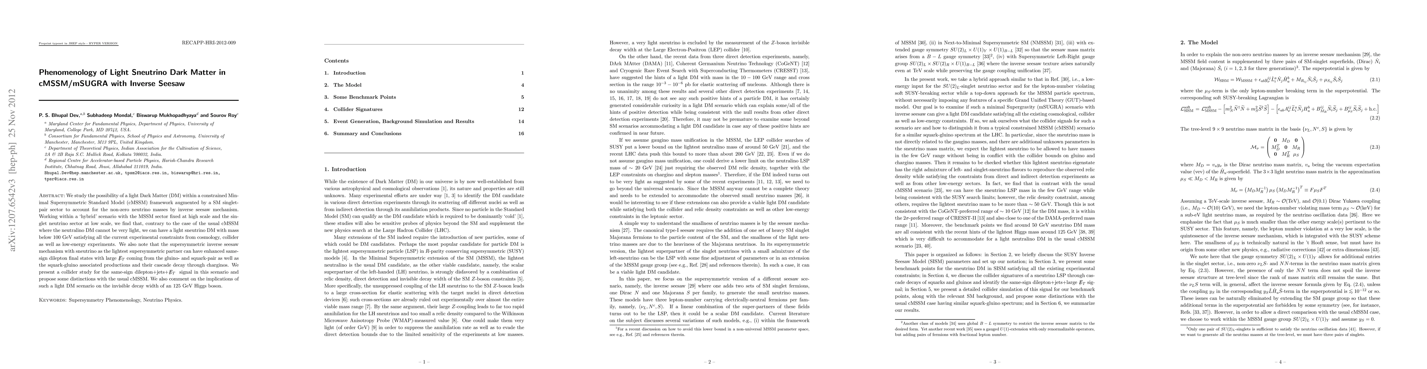 This paper explores light sneutrino dark matter within a constrained Minimal Supersymmetric Standard Model (cMSSM) enhanced by an inverse seesaw mechanism. It finds that a light sneutrino below 100 GeV can satisfy experimental constraints, unlike in the usual cMSSM, and discusses collider signatures and implications for the Higgs boson's invisible decay width.