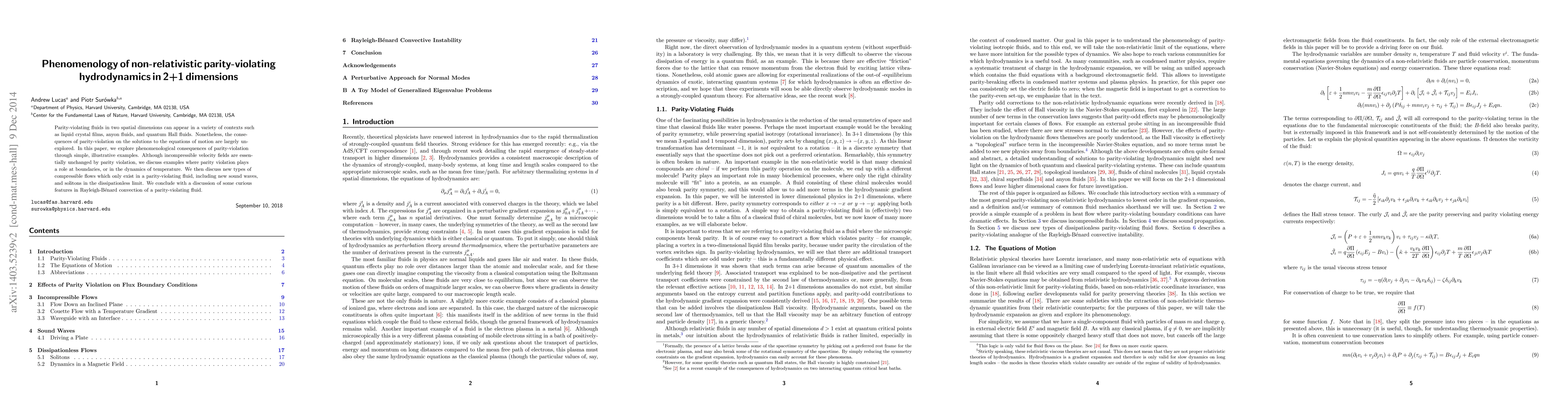 This paper explores the phenomenology of non-relativistic parity-violating hydrodynamics in 2+1 dimensions, demonstrating that while incompressible flows are largely unaffected, parity violation significantly influences boundary conditions, temperature dynamics, and introduces new compressible flows like unique sound waves and solitons. It also highlights peculiar behaviors in Rayleigh-Bénard convection in such fluids.