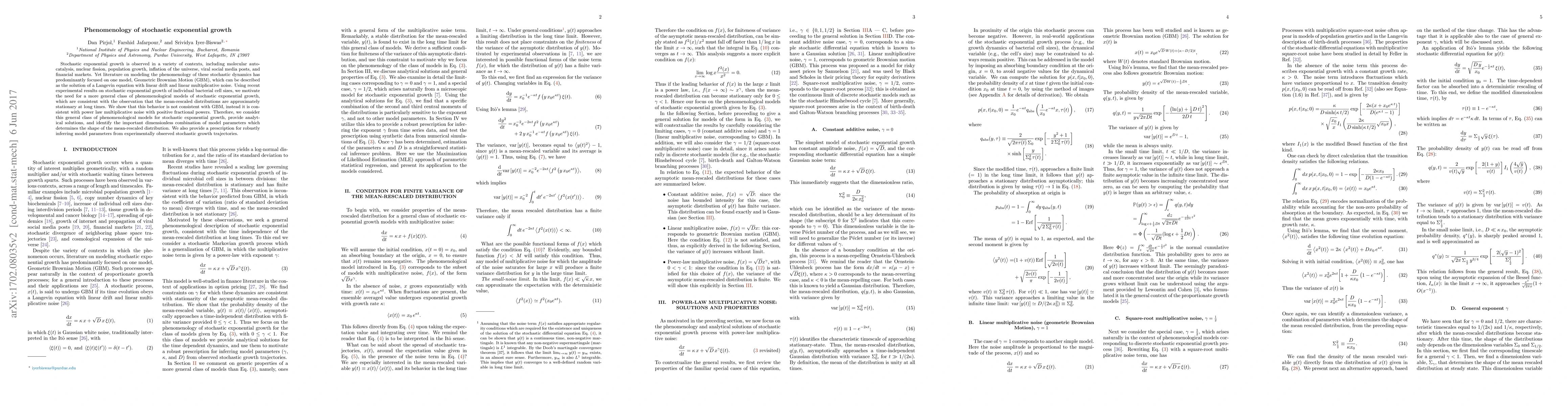 This paper explores the phenomenology of stochastic exponential growth beyond the traditional Geometric Brownian Motion model, proposing a new class of models with power law multiplicative noise to better fit observed data, such as bacterial cell sizes, and provides analytical solutions and methods for parameter inference.