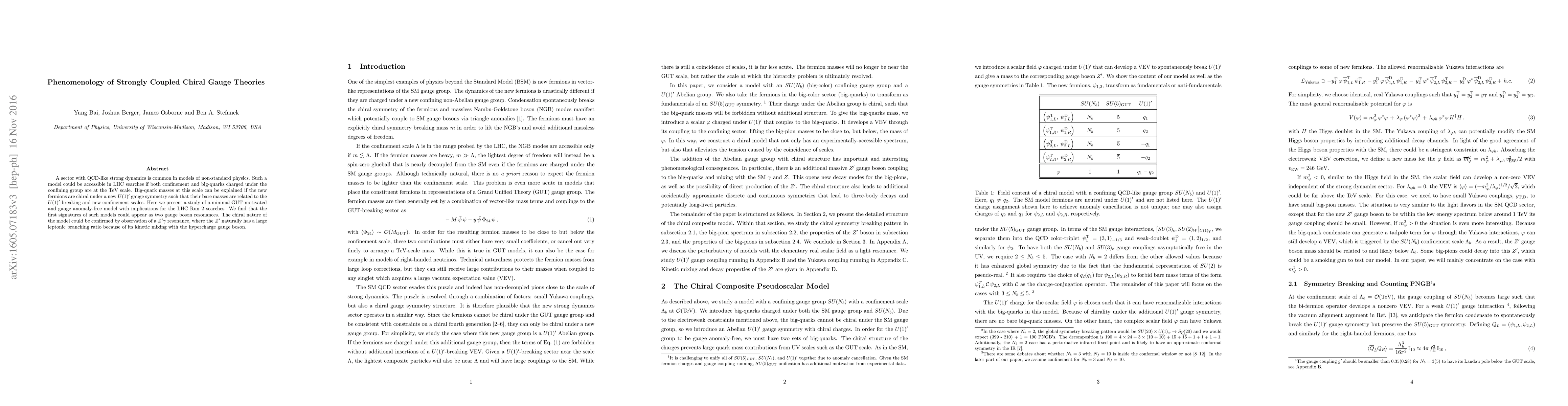 A sector with QCD-like strong dynamics is common in models of non-standard physics. Such a model could be accessible in LHC searches if both confinement and big-quarks charged under the confining group are at the TeV scale. Big-quark masses at this scale can be explained if the new fermions are chiral under a new $U(1)^\prime$ gauge symmetry such that their bare masses are related to the $U(1)^\prime$-breaking and new confinement scales. Here we present a study of a minimal GUT-motivated and gauge anomaly-free model with implications for the LHC Run 2 searches. We find that the first signatures of such models could appear as two gauge boson resonances. The chiral nature of the model could be confirmed by observation of a $Z^\prime \gamma$ resonance, where the $Z^\prime$ naturally has a large leptonic branching ratio because of its kinetic mixing with the hypercharge gauge boson.