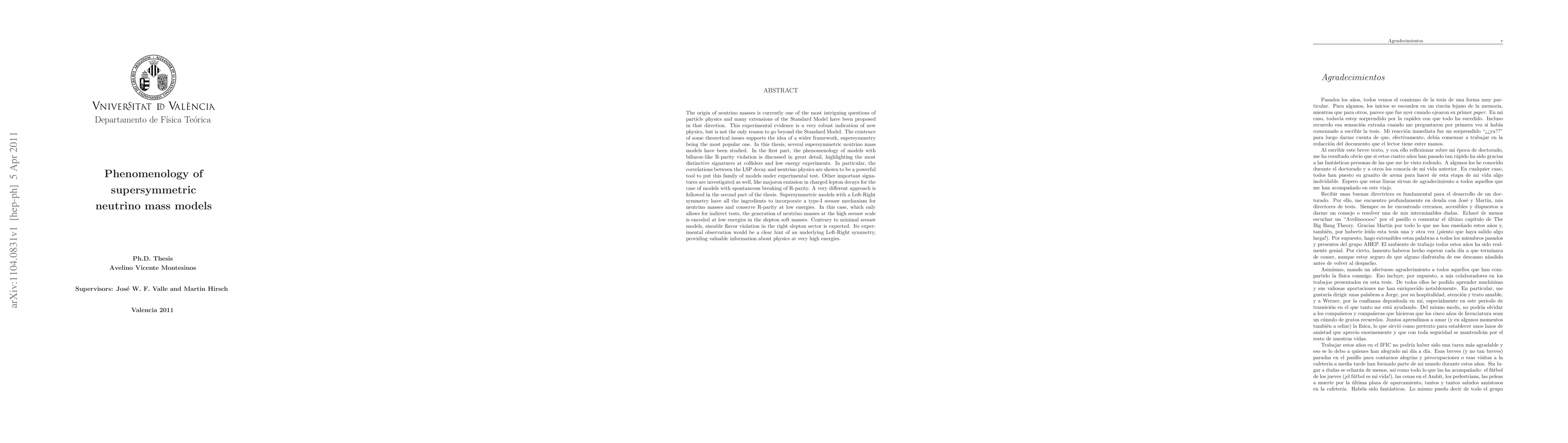 The research explores supersymmetric neutrino mass models, specifically focusing on bilinear-like R-parity violation and Left-Right symmetric models. It investigates distinctive signatures at colliders and low-energy experiments, including LSP decay correlations with neutrino physics and majoron emission in charged lepton decays.