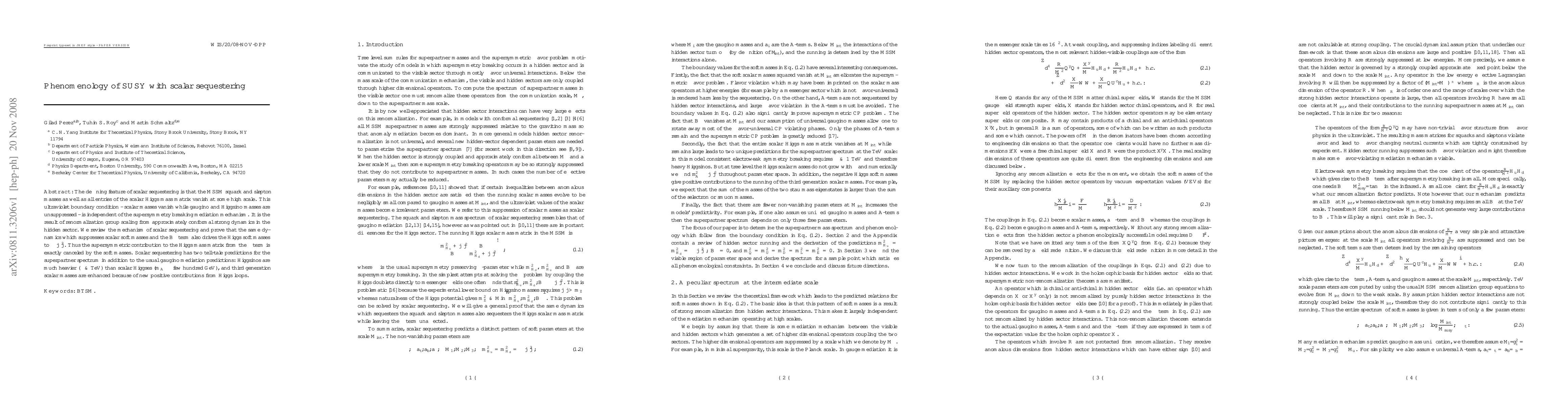 The paper discusses scalar sequestering, a mechanism where MSSM squark and slepton masses, along with scalar Higgs mass matrix entries, vanish at high scales due to conformal strong dynamics in the hidden sector. This results in Higgsinos being heavier than scalar Higgses and enhanced third-generation scalar masses from Higgs loop contributions, distinct from gaugino mediation predictions.