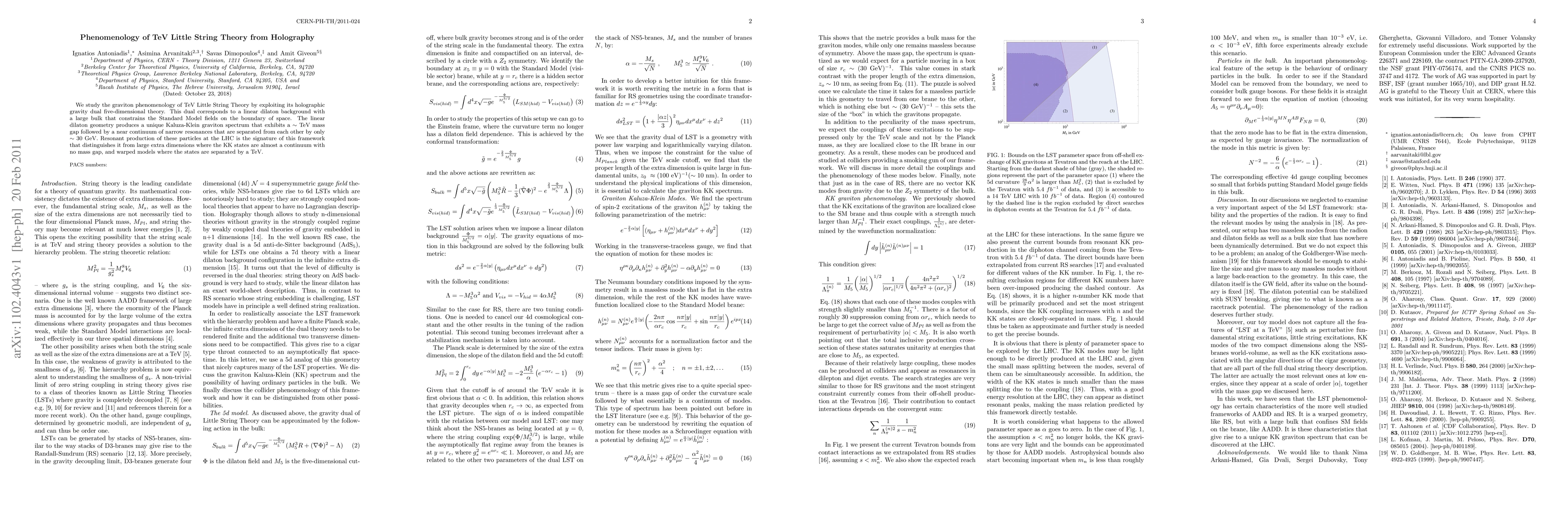 This paper investigates the graviton phenomenology in TeV Little String Theory through its holographic dual, revealing a unique Kaluza-Klein spectrum with a ~TeV mass gap and narrow resonances separated by ~30 GeV, distinct from large extra dimensions and warped models. The LHC's resonant production of these particles serves as a signature of this framework.