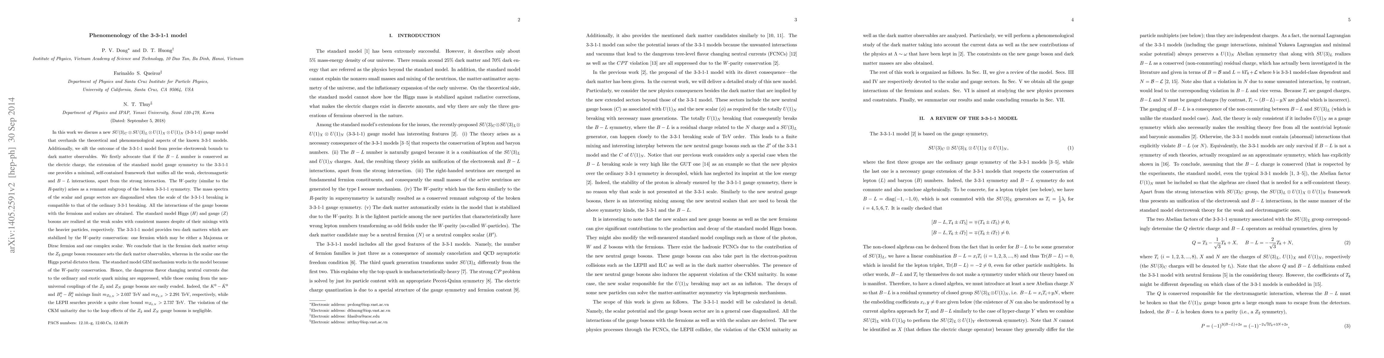 We discuss a new SU(3)_C X SU(3)_L X U(1)_X X U(1)_N (3-3-1-1) gauge model that overhauls the theoretical and phenomenological aspects of the known 3-3-1 models. Additionally, we sift the outcome of the 3-3-1-1 model from precise electroweak bounds to dark matter observables. The mass spectra of the scalar and gauge sectors are diagonalized when the scale of the 3-3-1-1 breaking is compatible to that of the ordinary 3-3-1 breaking. All the interactions of the gauge bosons with the fermions and scalars are obtained. The 3-3-1-1 model provides two dark matters which are stabilized by the W-parity conservation: one fermion which may be either a Majorana or Dirac fermion and one complex scalar. We conclude that in the fermion dark matter setup the Z_2 gauge boson resonance sets the dark matter observables, whereas in the scalar one the Higgs portal dictates them. The standard model GIM mechanism works in the model because of the W-parity conservation. Hence, the dangerous flavor changing neutral currents due to the ordinary and exotic quark mixing are suppressed, while those coming from the non-universal couplings of the Z_2 and Z_N gauge bosons are easily evaded. Indeed, the K^0-\bar{K}^0 and B^0_s-\bar{B}^0_s mixings limit m_{Z_{2,N}}>2.037 TeV and m_{Z_{2,N}}>2.291 TeV, respectively, while the LEPII searches provide a quite close bound m_{Z_{2,N}}>2.737 TeV. The violation of the CKM unitarity due to the loop effects of the Z_2 and Z_N gauge bosons is negligible. [Full abstract is given in the text.]