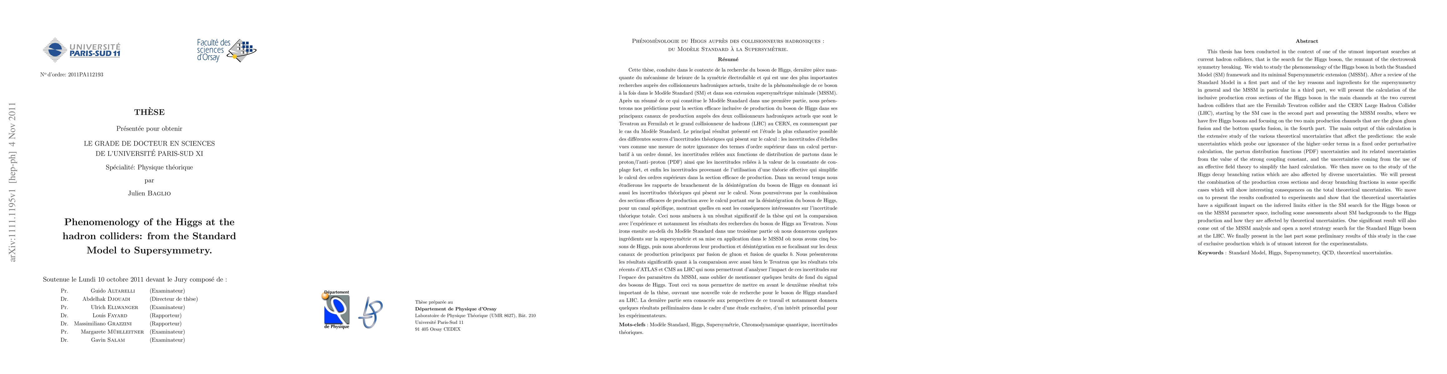 The Higgs boson, relic of the spontaneous electroweak symmetry breaking, is one of the most important searches at current hadron colliders. This thesis wishes to present theoretical predictions for the inclusive production and decay of the Higgs boson(s) either in the context of the Standard Model (SM) or in its minimal supersymmetric extension (MSSM) where five Higgs bosons are present. We will focus on the two major hadron colliders, the Fermilab Tevatron collider and the CERN Large Hadron Collider (LHC) which is running at 7 TeV. We will present the predictions for the dominant production and decay channels and describe the thorough analysis of the theoretical uncertainties affecting these predictions that has been conducted. We will give the implications on experimental searches and in particular revisit the inferred limits on SM Higgs boson mass and on the MSSM parameter space. We will also give an important consequence on the SM Higgs search in the $H \to \tau \tau$ channel. Some perspectives for futur works will be given in the end.