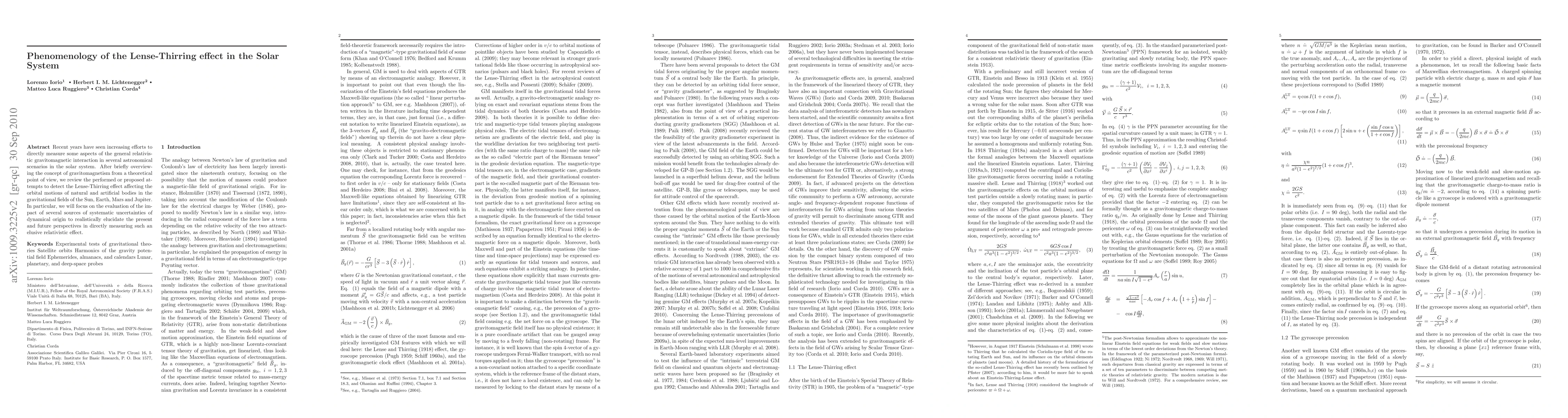 This paper reviews efforts to detect the Lense-Thirring effect, a gravitomagnetic influence in general relativity, in the solar system, focusing on the Sun, Earth, Mars, and Jupiter. It evaluates the impact of systematic uncertainties to assess current and future measurement prospects.