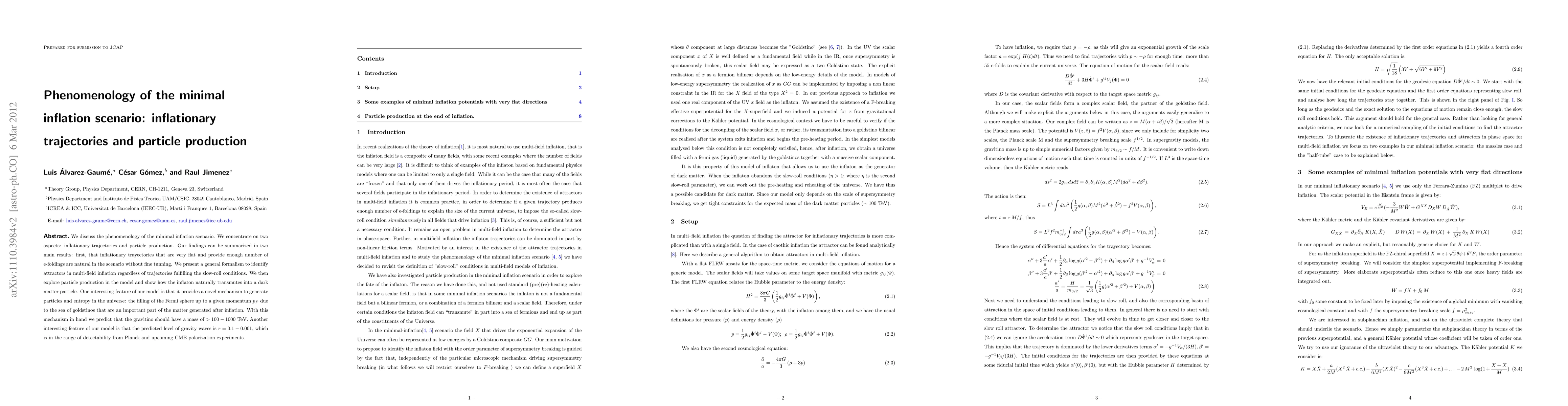 We discuss the phenomenology of the minimal inflation scenario. We concentrate on two aspects: inflationary trajectories and particle production. Our findings can be summarized in two main results: first, that inflationary trayectories that are very flat and provide enough number of e-foldings are natural in the scenario without fine tunning. We present a general formalism to identify attractors in multi-field inflation regardless of trajectories fulfilling the slow-roll conditions. We then explore particle production in the model and show how the inflaton naturally transmutes into a dark matter particle. One interesting feature of our model is that it provides a novel mechanism to generate particles and entropy in the universe: the filling of the Fermi sphere up to a given momentum p_F due to the sea of goldstinos that are an important part of the matter generated after inflation. With this mechanism in hand we predict that the gravitino should have a mass of > 100-1000 TeV. Another interesting feature of our model is that the predicted level of gravity waves is r=0.1 - 0.001, which is in the range of detectability from Planck and upcoming CMB polarization experiments.