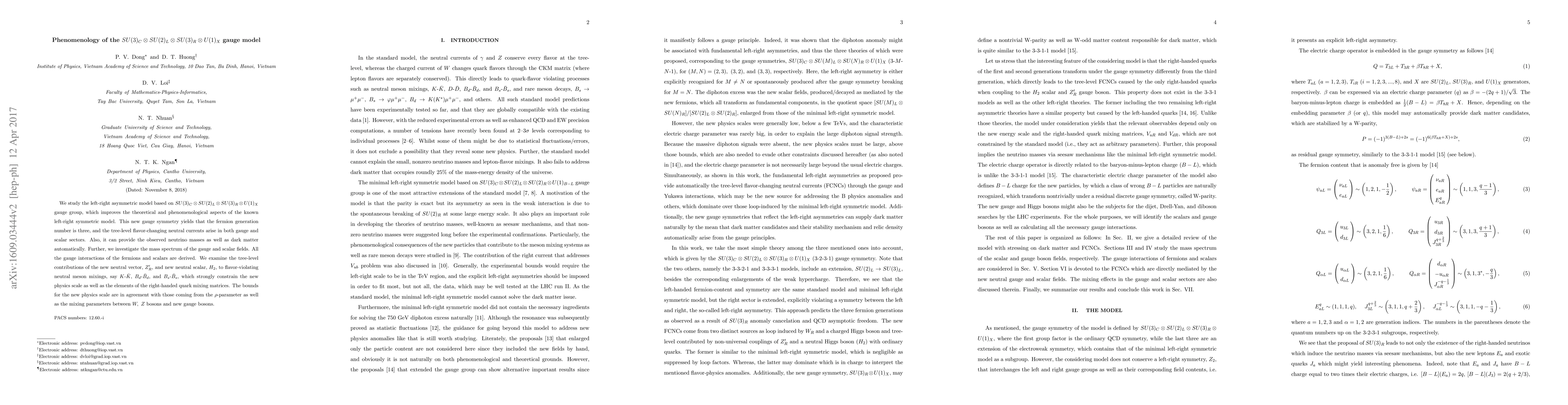 This paper explores the phenomenology of a left-right asymmetric gauge model based on SU(3)_C \otimes SU(2)_L \otimes SU(3)_R \otimes U(1)_X, which enhances the left-right symmetric model. It predicts three fermion generations and naturally explains observed neutrino masses and dark matter, while also constraining the new physics scale through flavor-violating neutral meson mixings.