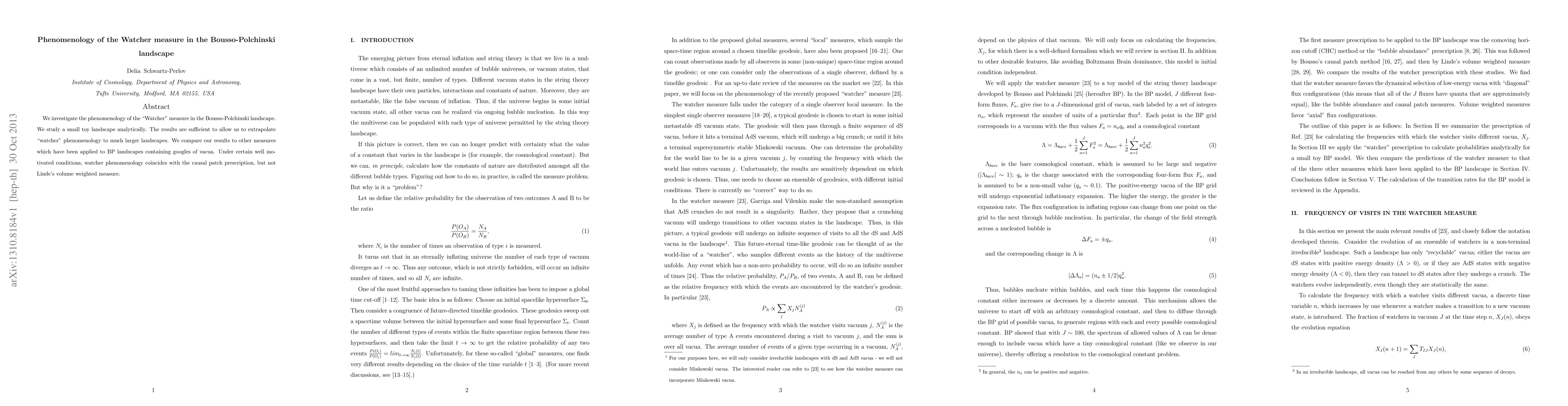 This paper explores the "Watcher" measure in the Bousso-Polchinski landscape, analyzing a small toy landscape to extrapolate its phenomenology to larger landscapes. It finds that under certain conditions, the Watcher measure aligns with the causal patch prescription but differs from Linde's volume weighted measure.
