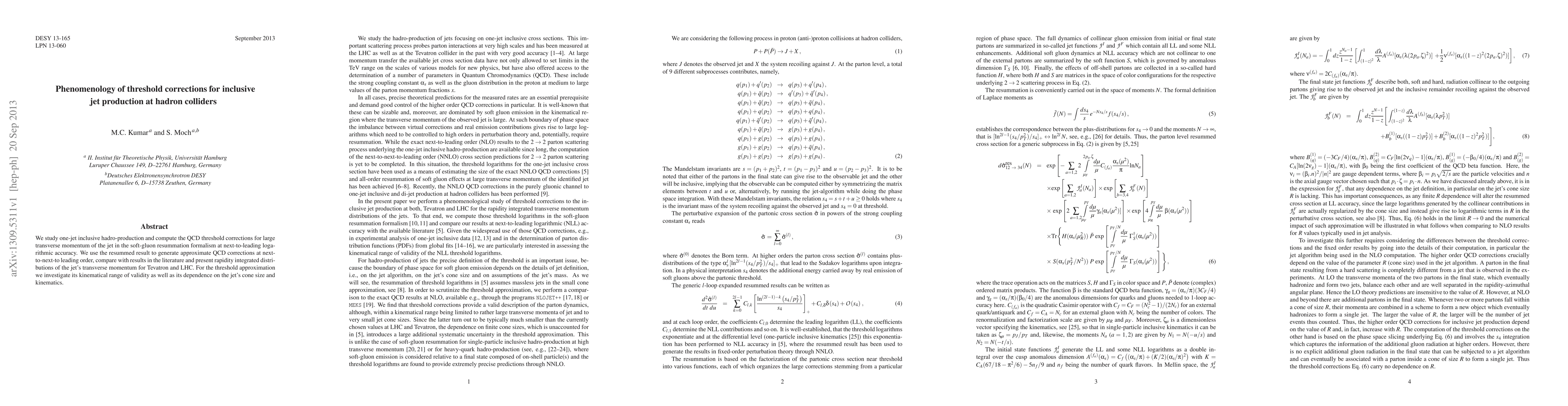 We study one-jet inclusive hadro-production and compute the QCD threshold corrections for large transverse momentum of the jet in the soft-gluon resummation formalism at next-to-leading logarithmic accuracy. We use the resummed result to generate approximate QCD corrections at next-to-next-to leading order, compare with results in the literature and present rapidity integrated distributions of the jet's transverse momentum for Tevatron and LHC. For the threshold approximation we investigate its kinematical range of validity as well as its dependence on the jet's cone size and kinematics.