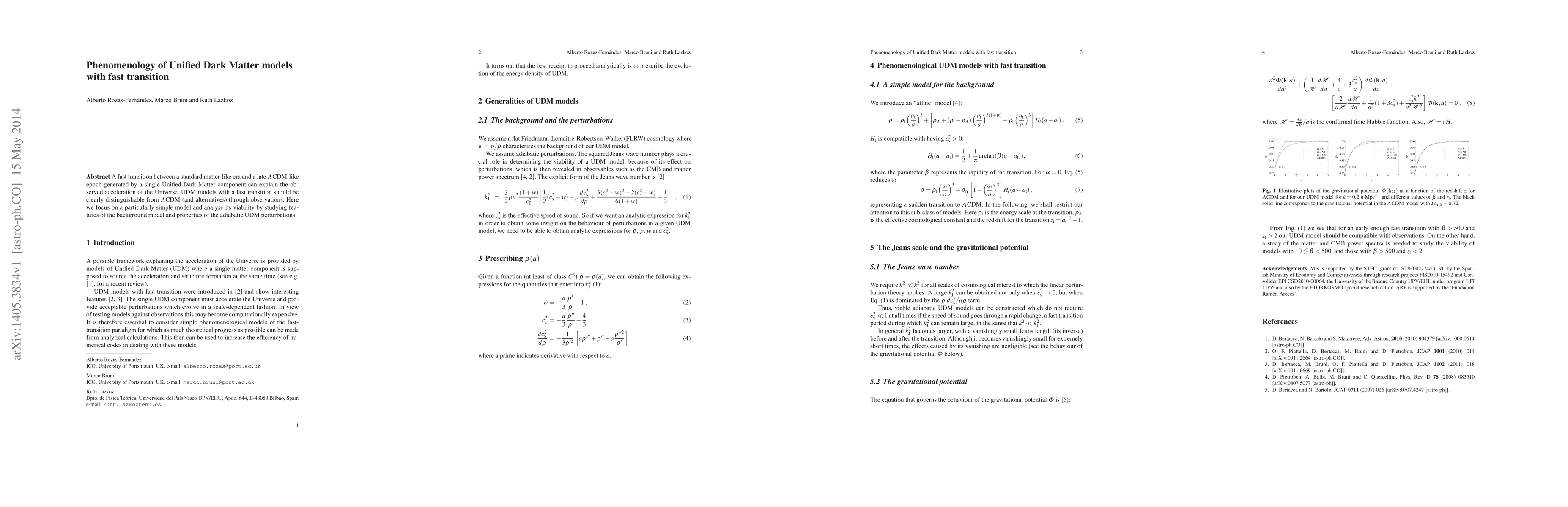 A fast transition between a standard matter-like era and a late $\Lambda$CDM-like epoch generated by a single Unified Dark Matter component can explain the observed acceleration of the Universe. UDM models with a fast transition should be clearly distinguishable from $\Lambda$CDM (and alternatives) through observations. Here we focus on a particularly simple model and analyse its viability by studying features of the background model and properties of the adiabatic UDM perturbations.