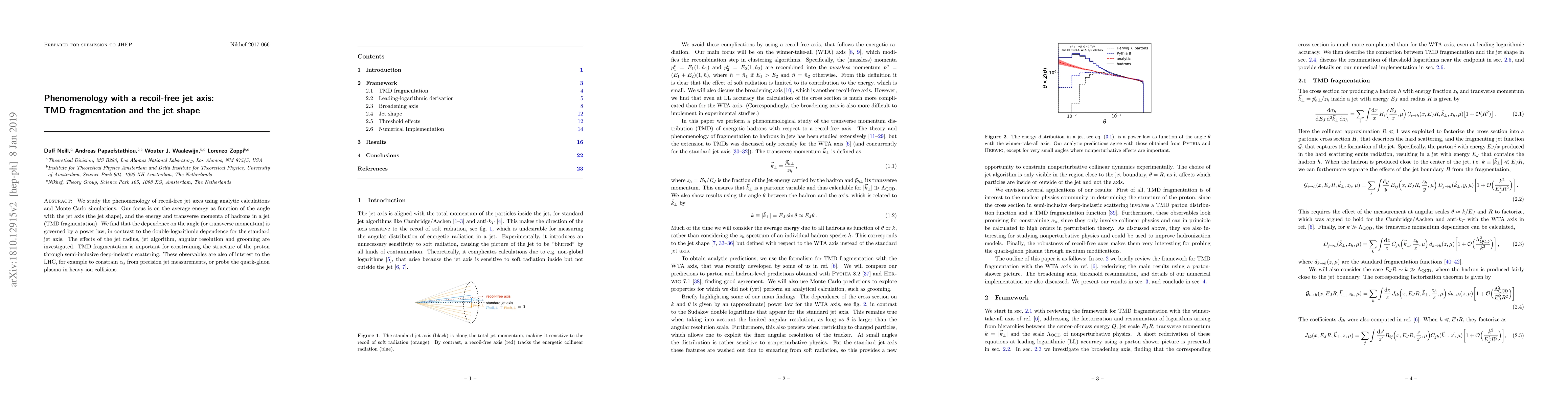 We study the phenomenology of recoil-free jet axes using analytic calculations and Monte Carlo simulations. Our focus is on the average energy as function of the angle with the jet axis (the jet shape), and the energy and transverse momenta of hadrons in a jet (TMD fragmentation). We find that the dependence on the angle (or transverse momentum) is governed by a power law, in contrast to the double-logarithmic dependence for the standard jet axis. The effects of the jet radius, jet algorithm, angular resolution and grooming are investigated. TMD fragmentation is important for constraining the structure of the proton through semi-inclusive deep-inelastic scattering. These observables are also of interest to the LHC, for example to constrain $\alpha_s$ from precision jet measurements, or probe the quark-gluon plasma in heavy-ion collisions.