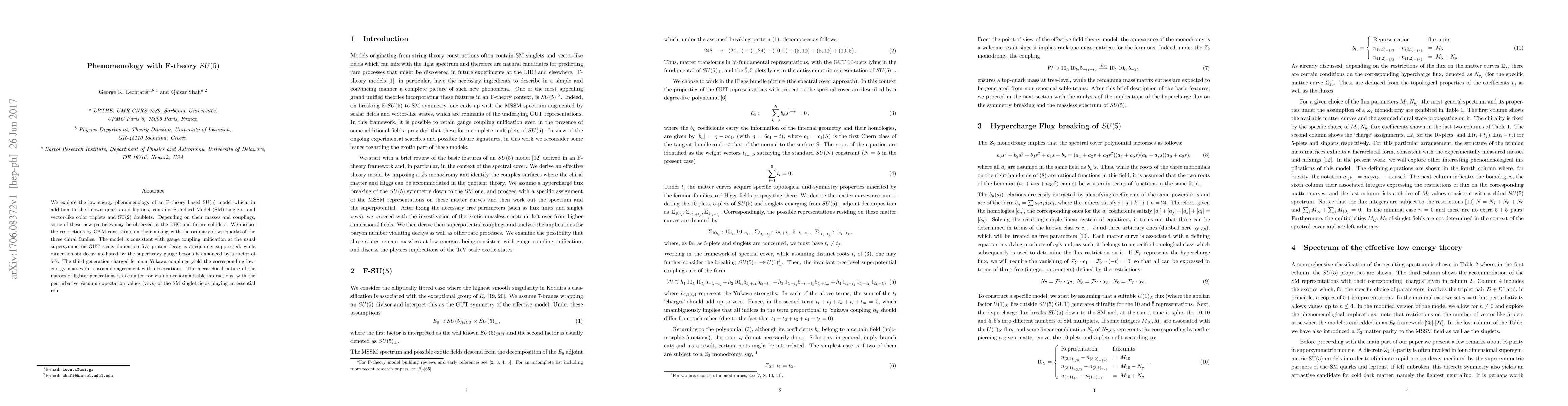The paper presents a detailed analysis of an F-theory SU(5) model, incorporating additional vector-like pairs and SM singlets, and examines its implications for low-energy phenomenology, gauge coupling unification, and proton decay.
