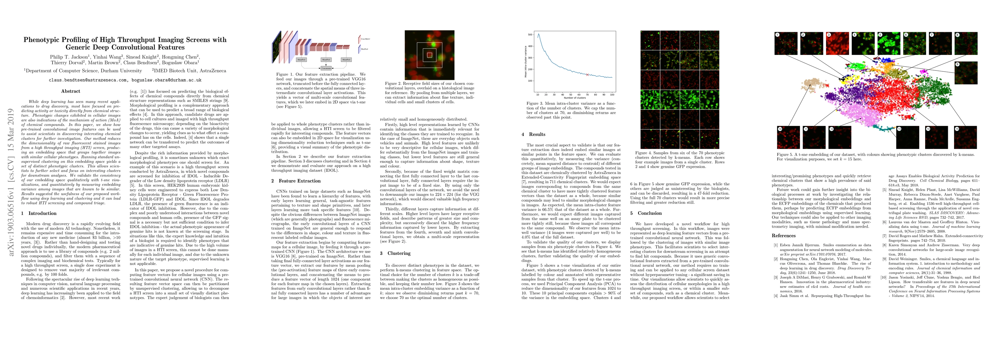 This paper proposes a method using pre-trained deep convolutional features to reduce the dimensionality of high throughput imaging screens, enabling the discovery of distinct phenotypic clusters in cellular images. The approach aids in identifying interesting chemical clusters for further investigation, validated through qualitative and quantitative assessments.