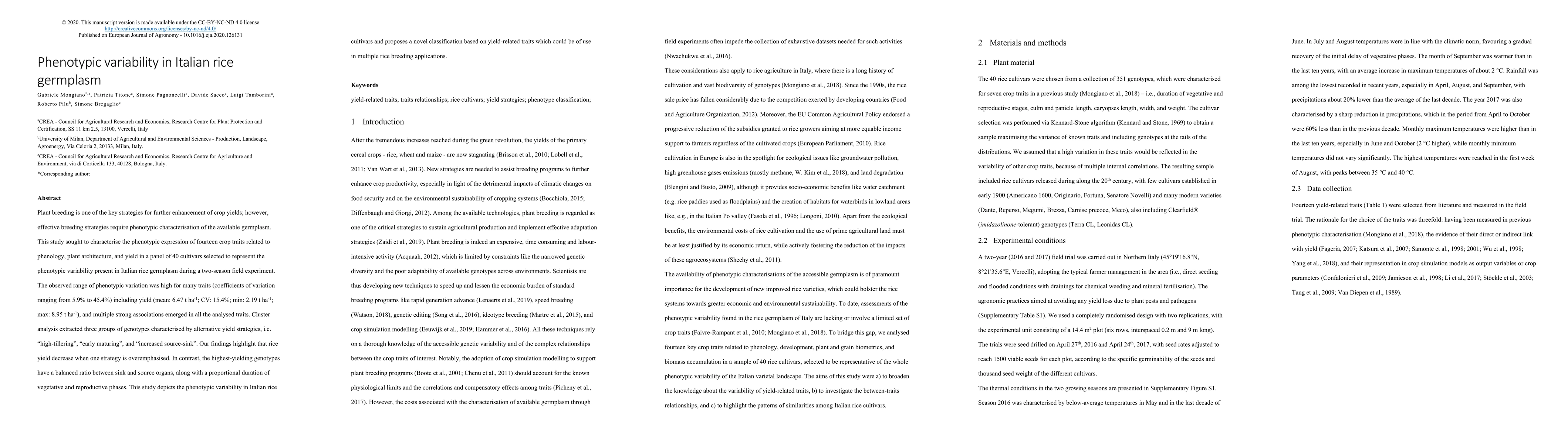 This study investigates the phenotypic variability of 40 Italian rice cultivars, identifying high variation in traits like yield and plant architecture, and classifying them into three groups based on yield strategies: "high-tillering", "early maturing", and "increased source-sink". The findings suggest balanced yield strategies yield the highest, providing valuable insights for rice breeding programs.