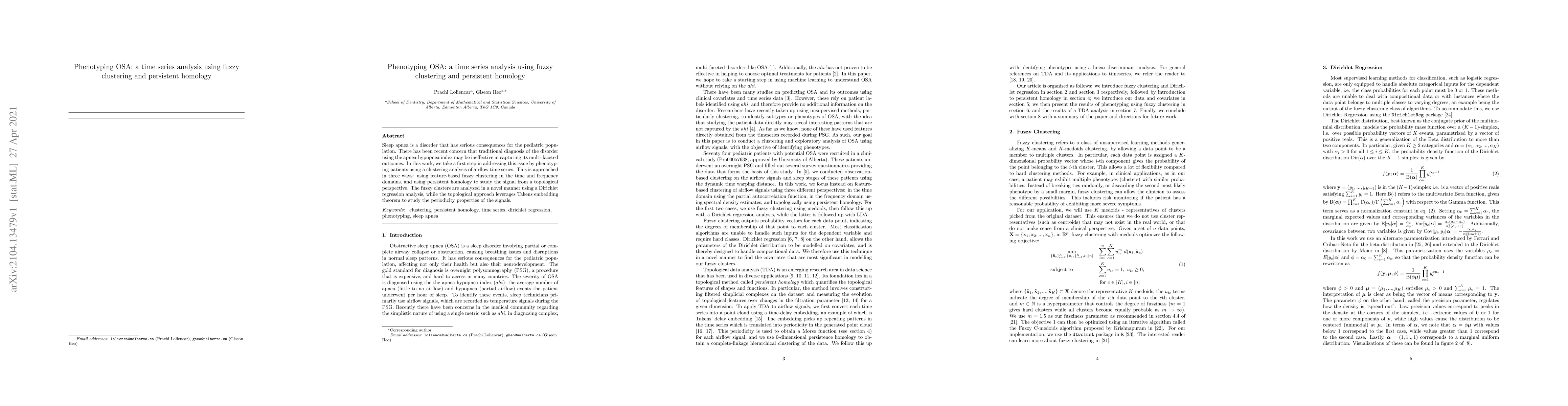Sleep apnea is a disorder that has serious consequences for the pediatric population. There has been recent concern that traditional diagnosis of the disorder using the apnea-hypopnea index may be ineffective in capturing its multi-faceted outcomes. In this work, we take a first step in addressing this issue by phenotyping patients using a clustering analysis of airflow time series. This is approached in three ways: using feature-based fuzzy clustering in the time and frequency domains, and using persistent homology to study the signal from a topological perspective. The fuzzy clusters are analyzed in a novel manner using a Dirichlet regression analysis, while the topological approach leverages Takens embedding theorem to study the periodicity properties of the signals.