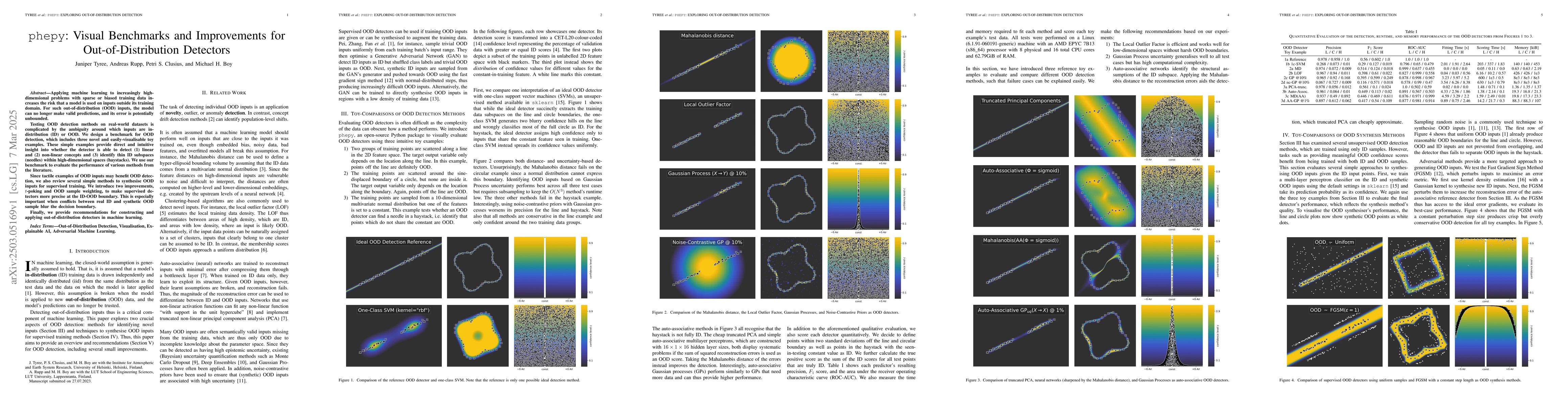 The paper introduces "phepy," a visual benchmark for evaluating out-of-distribution (OOD) detectors, featuring intuitive toy examples to assess their ability to detect linear and non-linear concepts and identify thin ID subspaces. It also proposes improvements like $t$-poking and OOD sample weighting to enhance the precision of supervised detectors at the ID-OOD boundary.