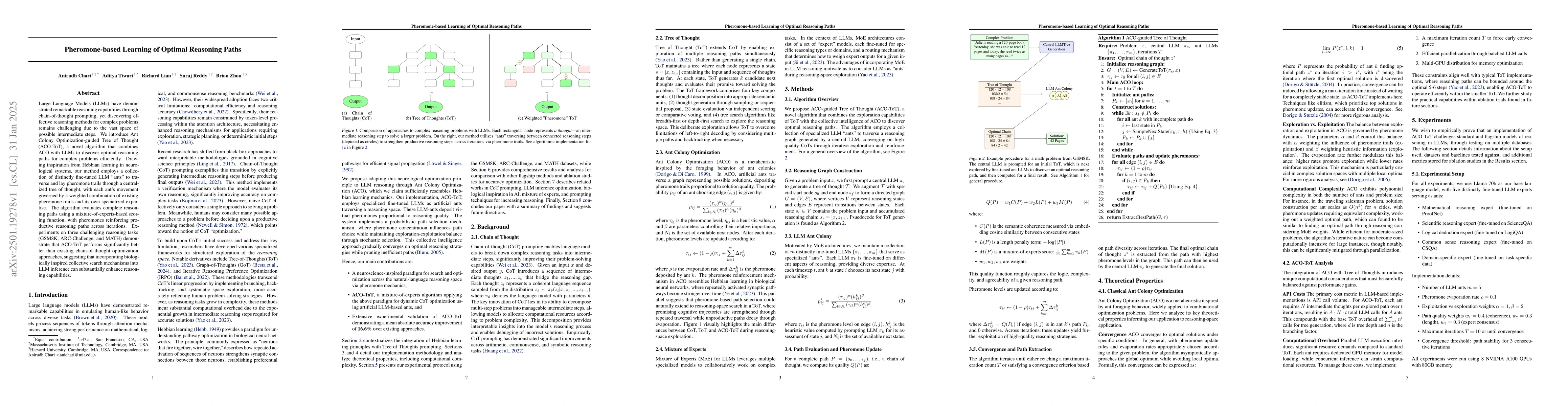The paper proposes Ant Colony Optimization-guided Tree of Thought (ACO-ToT), a novel method combining Ant Colony Optimization with LLMs to efficiently discover optimal reasoning paths. The algorithm uses fine-tuned LLMs to simulate ants laying pheromone trails, reinforcing successful reasoning paths, and outperforms existing chain-of-thought optimization on complex reasoning tasks.
