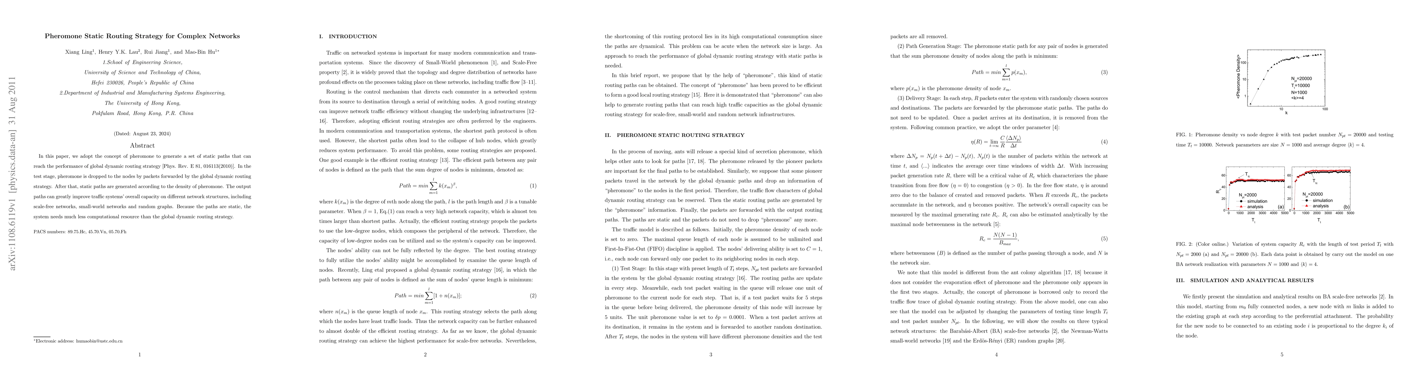 This paper proposes a pheromone static routing strategy to create efficient static paths in complex networks, achieving performance comparable to global dynamic routing. The static paths, generated based on pheromone density, significantly enhance network capacity with lower computational requirements.