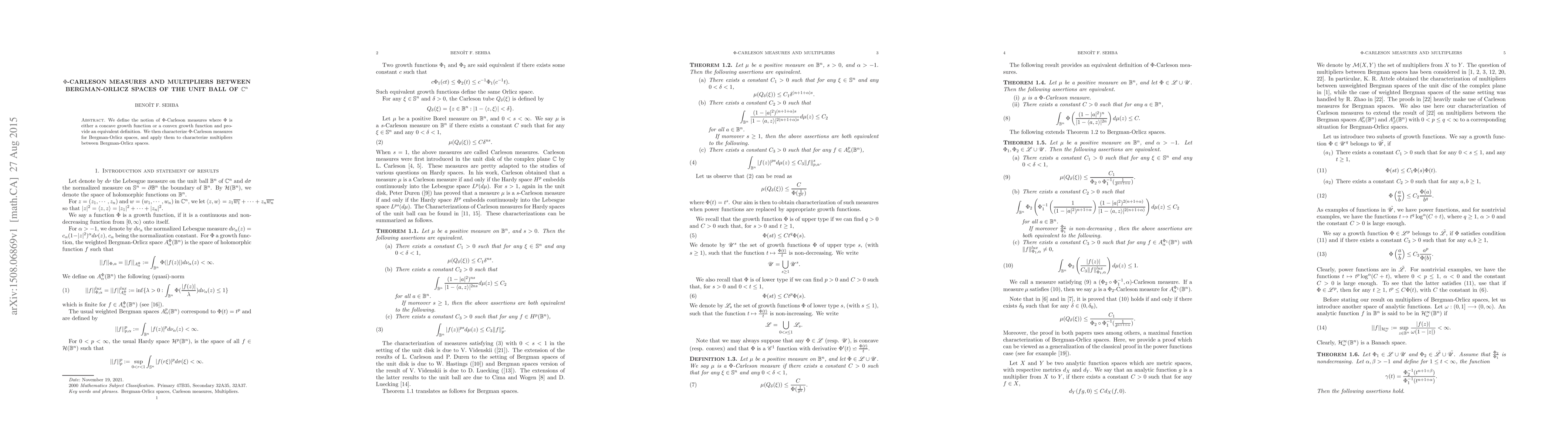 This paper introduces $\Phi$-Carleson measures for Bergman-Orlicz spaces, providing an equivalent definition for both concave and convex growth functions. It characterizes these measures and uses them to define multipliers between Bergman-Orlicz spaces of the unit ball in $\mathbb{C}^n$.