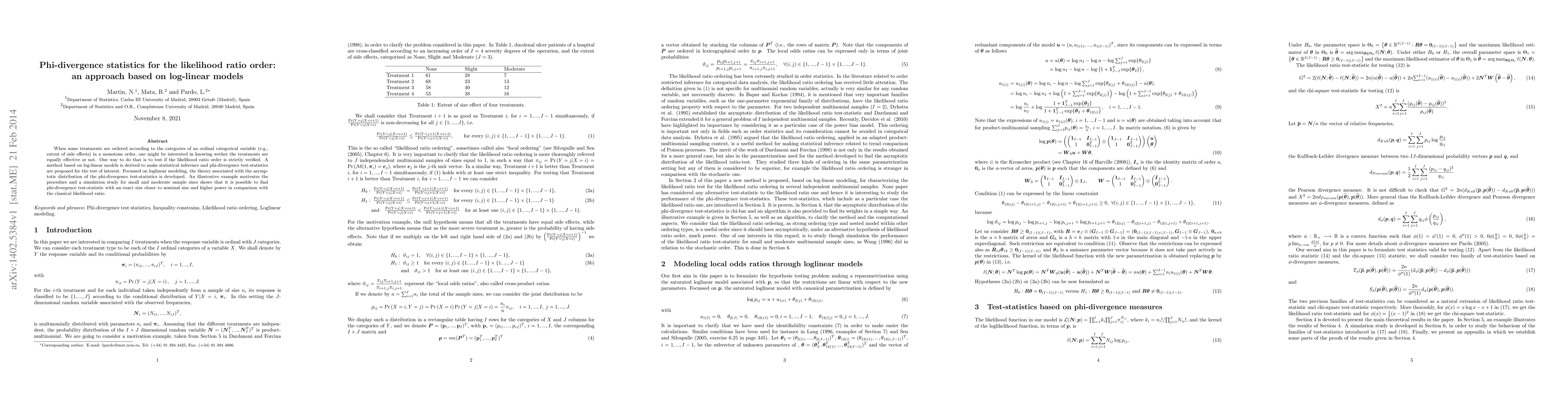 This paper proposes a method based on log-linear models to test the likelihood ratio order in treatments ordered by an ordinal categorical variable. It introduces phi-divergence test-statistics and develops the theory for their asymptotic distribution, demonstrating improved performance in simulations compared to classical likelihood ratio tests.