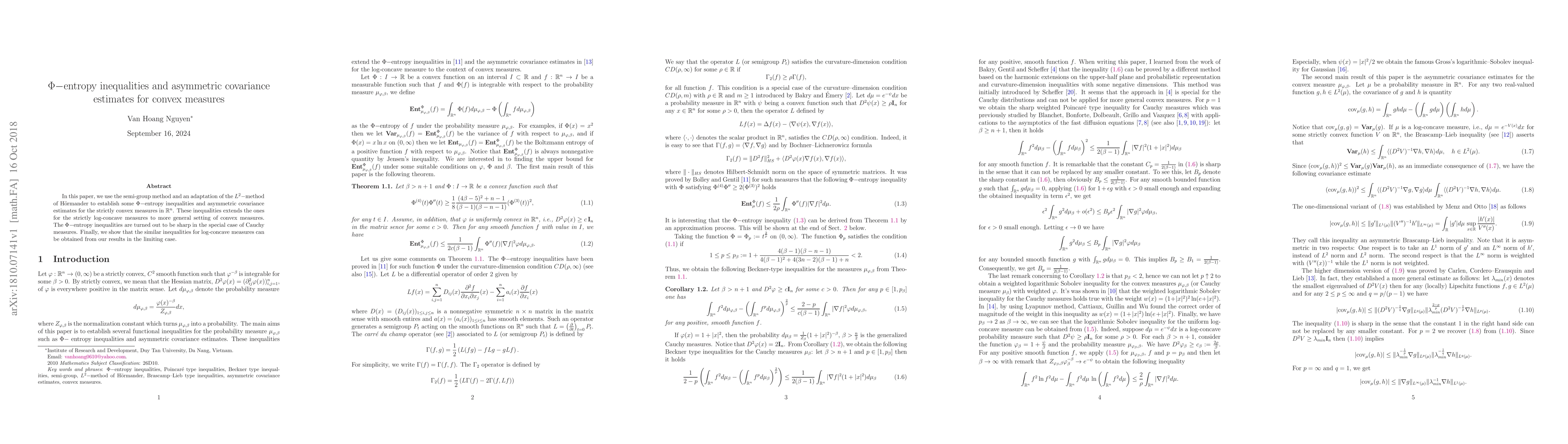 In this paper, we use the semi-group method and an adaptation of the $L^2-$method of H\"ormander to establish some $\Phi-$entropy inequalities and asymmetric covariance estimates for the strictly convex measures in $\mathbb R^n$. These inequalities extends the ones for the strictly log-concave measures to more general setting of convex measures. The $\Phi-$entropy inequalities are turned out to be sharp in the special case of Cauchy measures. Finally, we show that the similar inequalities for log-concave measures can be obtained from our results in the limiting case.