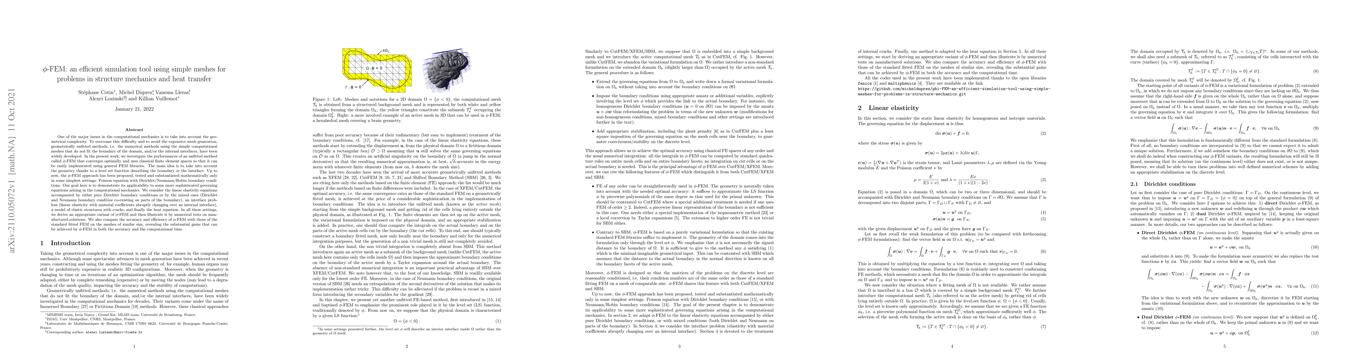 The paper presents $\phi$-FEM, an unfitted finite element method that uses simple meshes to handle complex geometries in computational mechanics, demonstrating its applicability to linear elasticity, interface problems, cracked structures, and heat transfer. The method shows significant accuracy and efficiency gains compared to standard fitted FEM.