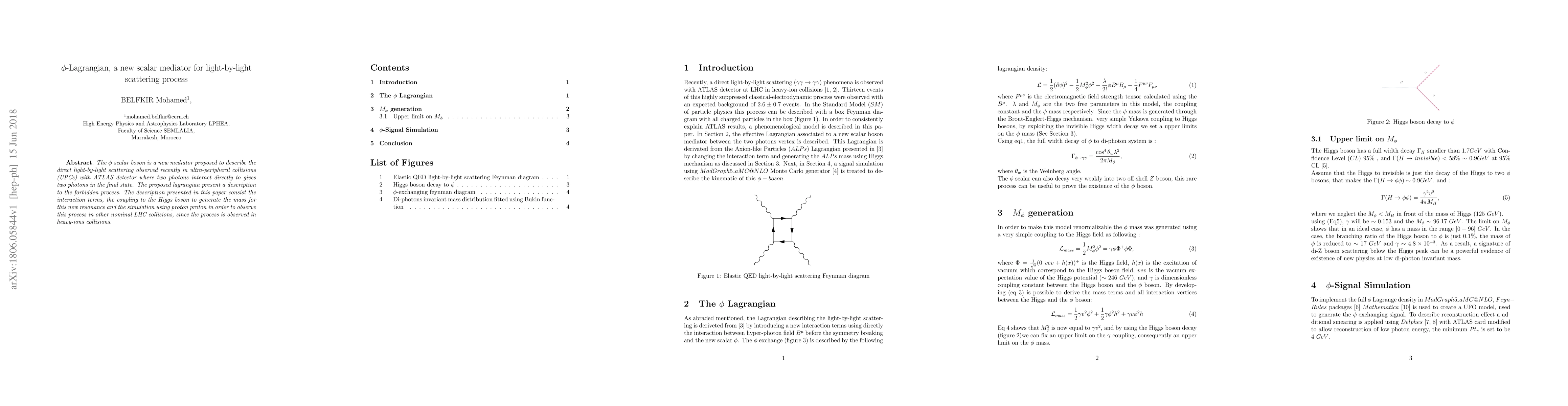 The $\phi$ scalar boson is a new mediator proposed to describe the direct light-by-light scattering observed recently in ultra-peripheral collisions (UPCs) with ATLAS detector where two photons interact directly to gives two photons in the final state. The proposed lagrangian present a description to the forbidden process. The description presented in this paper consist the interaction terms, the coupling to the Higgs boson to generate the mass for this new resonance and the simulation using proton proton in order to observe this process in other nominal LHC collisions, since the process is observed in heavy-ions collisions.