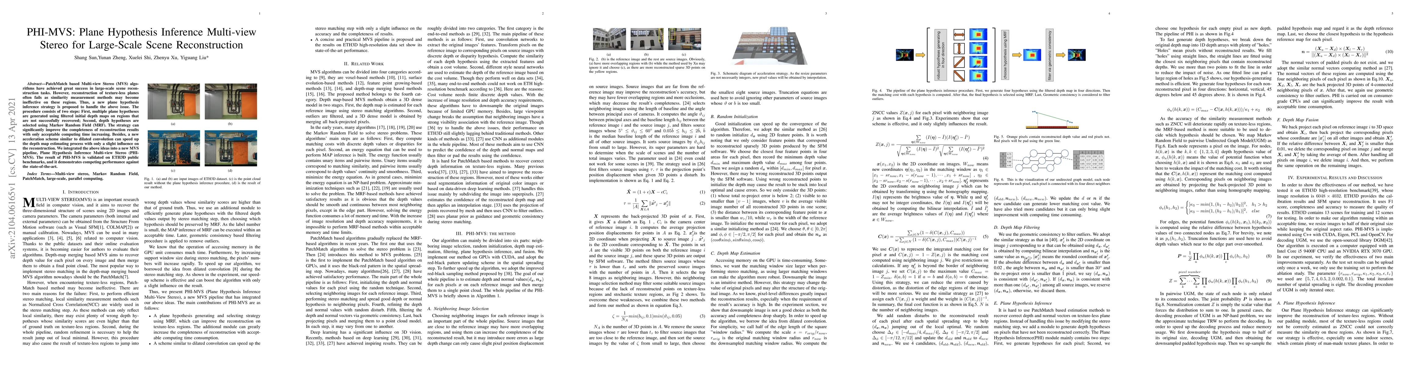 PHI-MVS introduces a plane hypothesis inference strategy to improve large-scale scene reconstruction by generating and selecting depth hypotheses for texture-less planes, achieving competitive results against the state-of-the-art while maintaining efficiency. An acceleration scheme further speeds up the depth map estimation process.