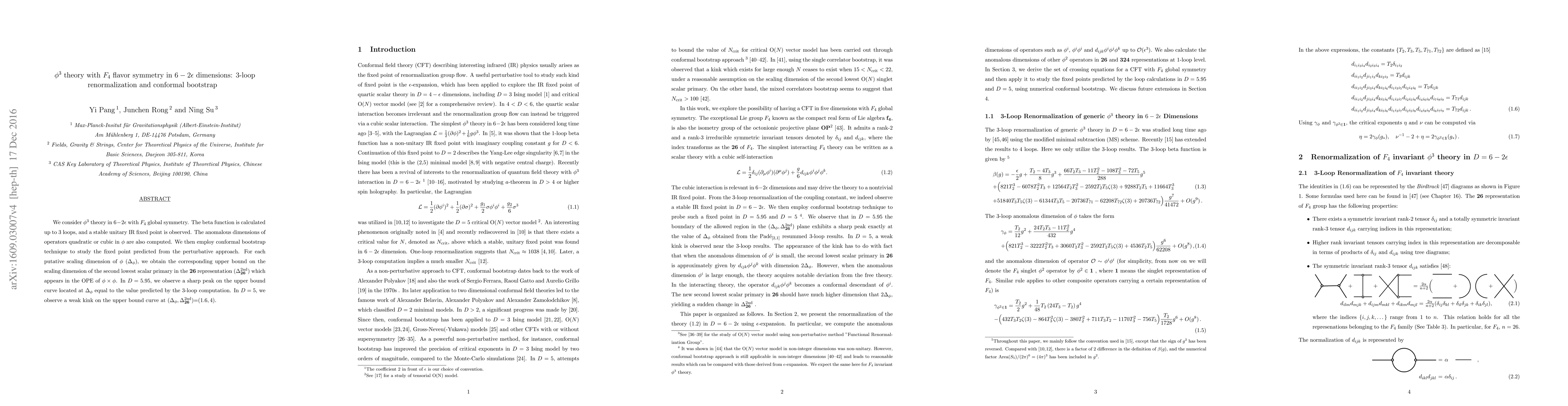 This paper studies $\phi^3$ theory in $6-2\epsilon$ dimensions with $F_4$ flavor symmetry, calculating the beta function up to 3 loops and identifying a stable unitary IR fixed point. It employs conformal bootstrap techniques to confirm the fixed point, finding a sharp peak in the upper bound curve for scaling dimensions at $D=5.95$ and a weak kink at $D=5$.
