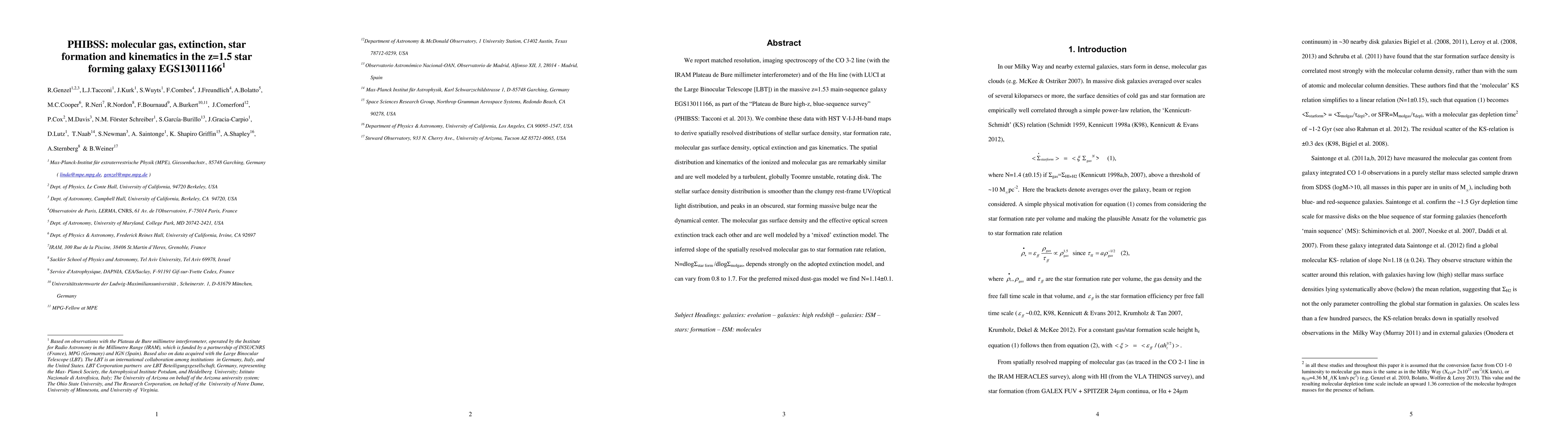 We report matched resolution, imaging spectroscopy of the CO J=3-2 line (with the IRAM Plateau de Bure millimeter interferometer) and of the H-alpha line (with LUCI at the Large Binocular Telescope)in the massive z=1.53 main-sequence galaxy EGS 13011166, as part of the "Plateau de Bure high-z, blue sequence survey (PHIBSS). We combine these data with HST V-J-J-H-band maps to derive spatially resolved distributions of stellar surface density, star formation rate, molecular gas surface density, optical extinction and gas kinematics. The spatial distribution and kinematics of the ionized and molecular gas are remarkably similar and are well modeled by a turbulent, globally Toomre unstable rotating disk. The stellar surface density distribution is smoother than the clumpy rest-frame UV/optical light distribution, and peaks in an obscured, star forming massive bulge near the dynamical center. The molecular gas surface density and the effective optical screen extinction track each other and are well modeled by a 'mixed' extinction model. The inferred slope of the spatially resolved molecular gas to star formation rate relation depends strongly on the adopted extinction model and can vary from 0.8 to 1.7. For the preferred mixed dust-gas model we find a near linear slope.