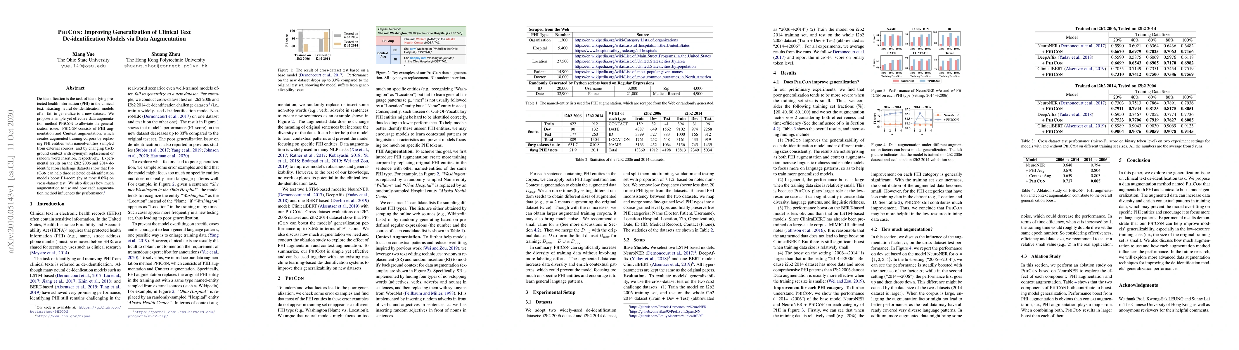 PHICON proposes a data augmentation method to improve the generalization of clinical text de-identification models, combining PHI and context augmentation techniques. This approach enhances model performance, boosting F1-scores by up to 8.6% on cross-dataset tests.