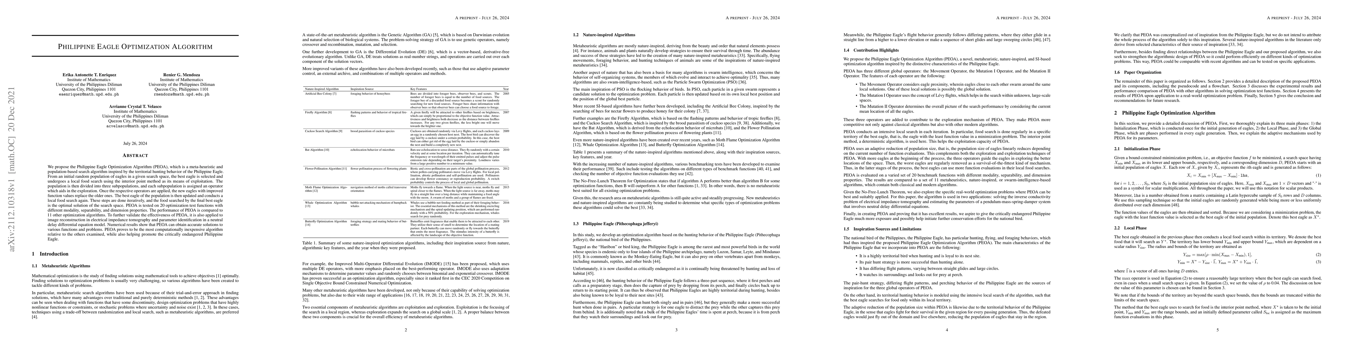The Philippine Eagle Optimization Algorithm (PEOA) is a new optimization algorithm inspired by the hunting behavior of the Philippine Eagle, which outperforms other algorithms in solving various functions and problems while being computationally inexpensive.